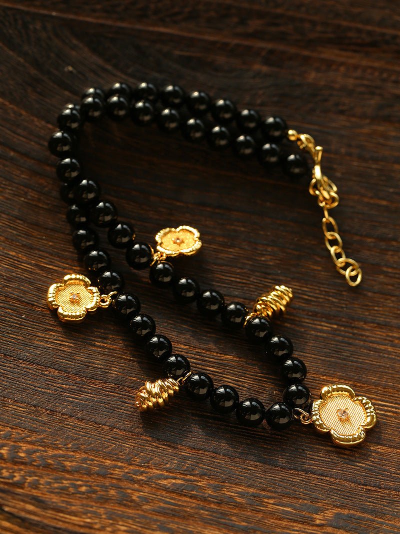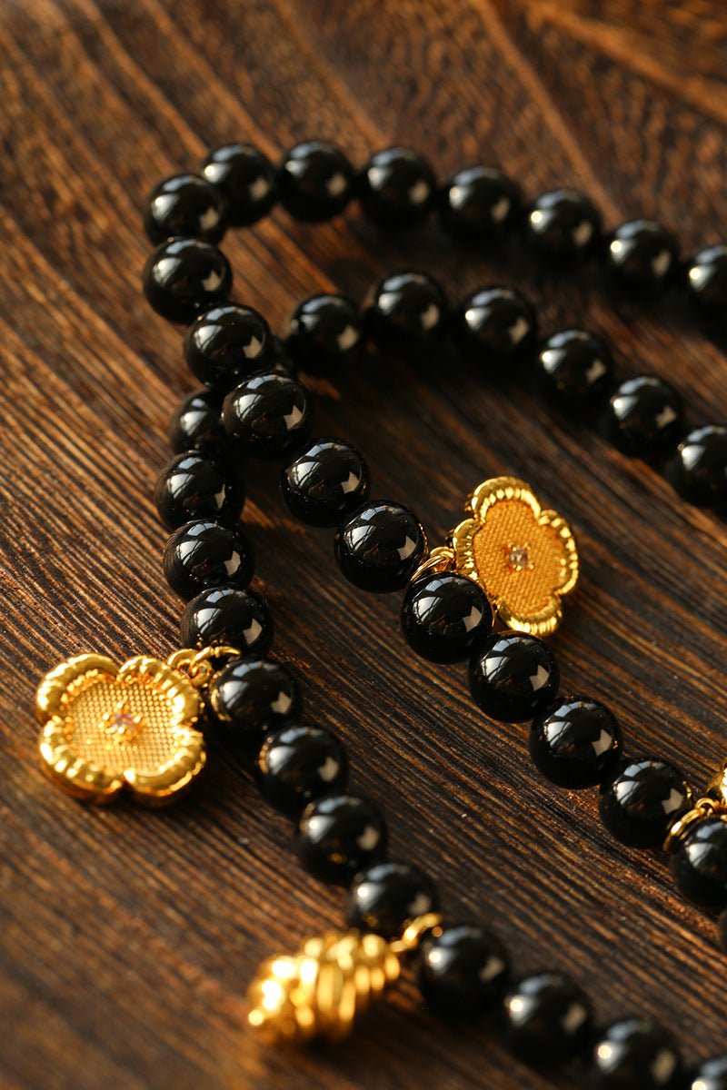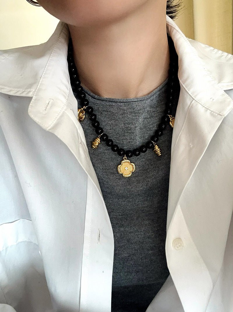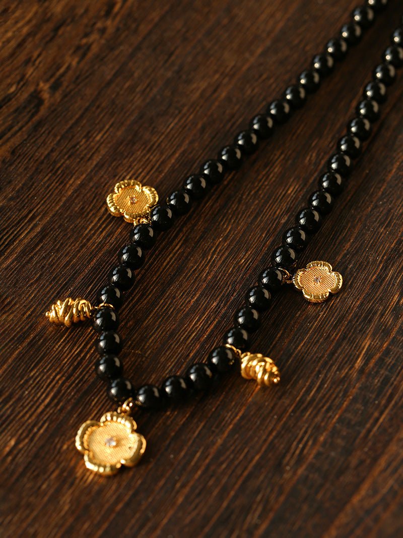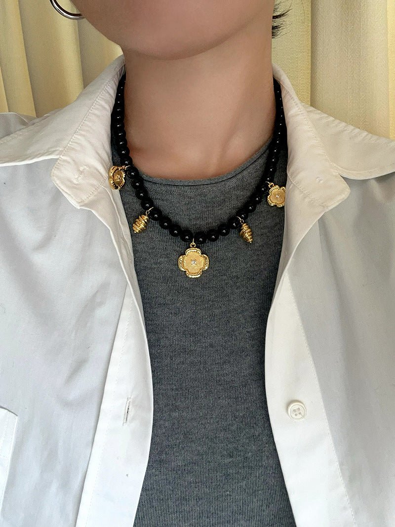 An original design layered necklace featuring 8mm natural black onyx beads and five delicate gold-tone pendants that resemble tiny works of art. The intricately embroidered four-leaf clover adds a touch of charm, while the vintage-inspired knotted gold chain brings subtle elegance.