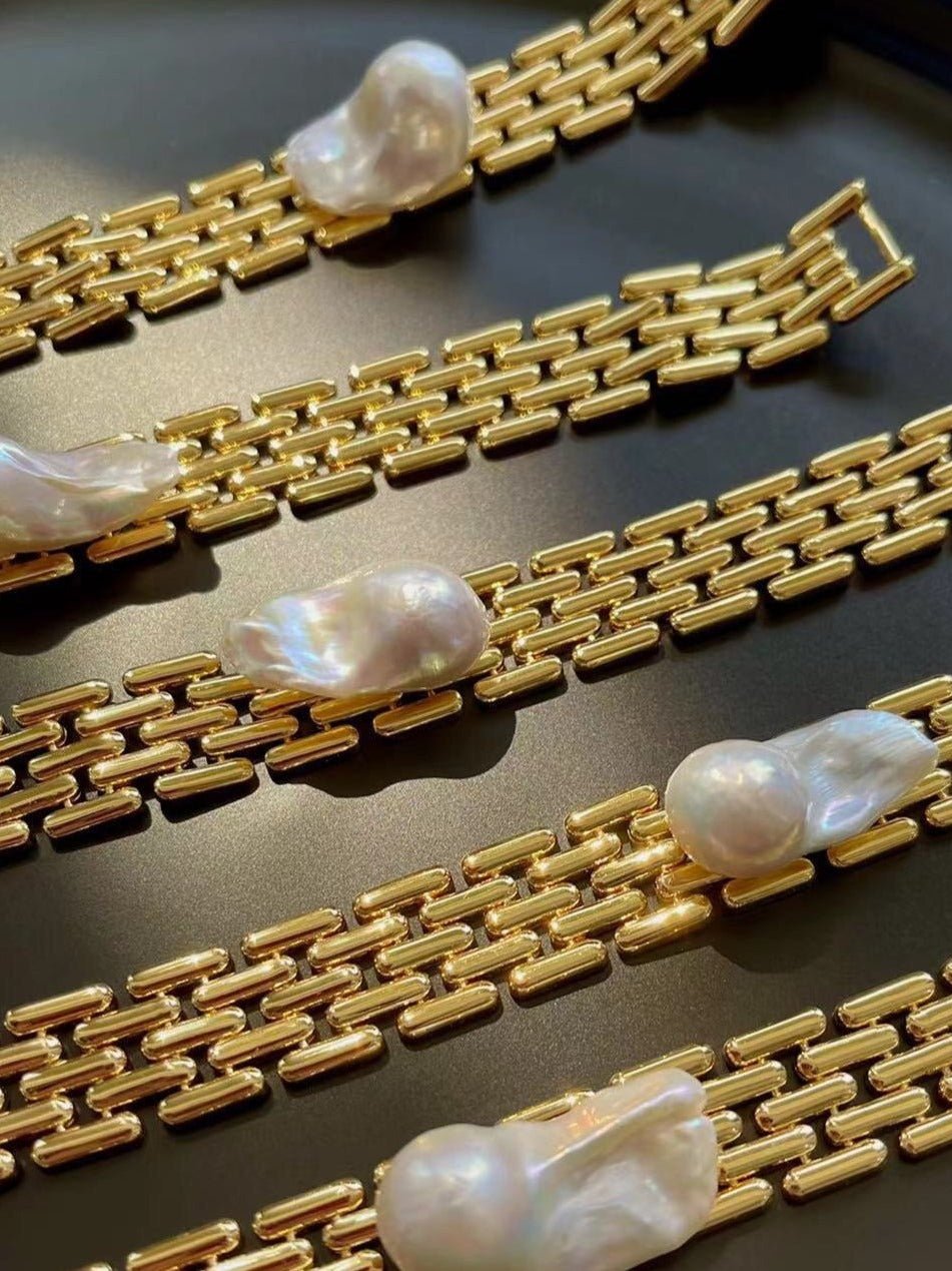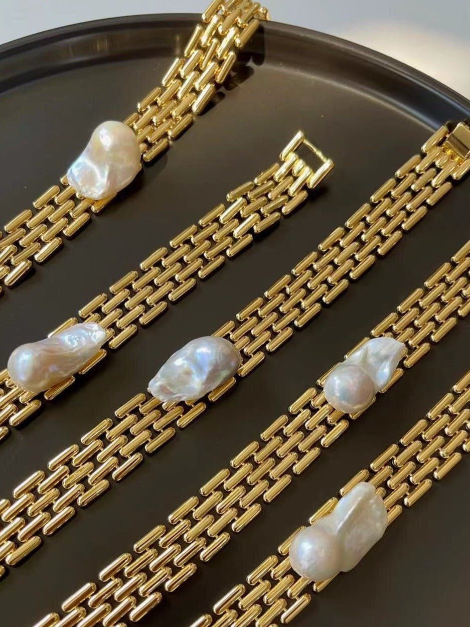 Elevate your accessory game with our Wide Chain Baroque Pearl Bracelet and add a touch of bold sophistication to your ensemble. Embrace the timeless allure of baroque pearls and the statement-making appeal of a wide chain, and let this exquisite bracelet become the centerpiece of your look.