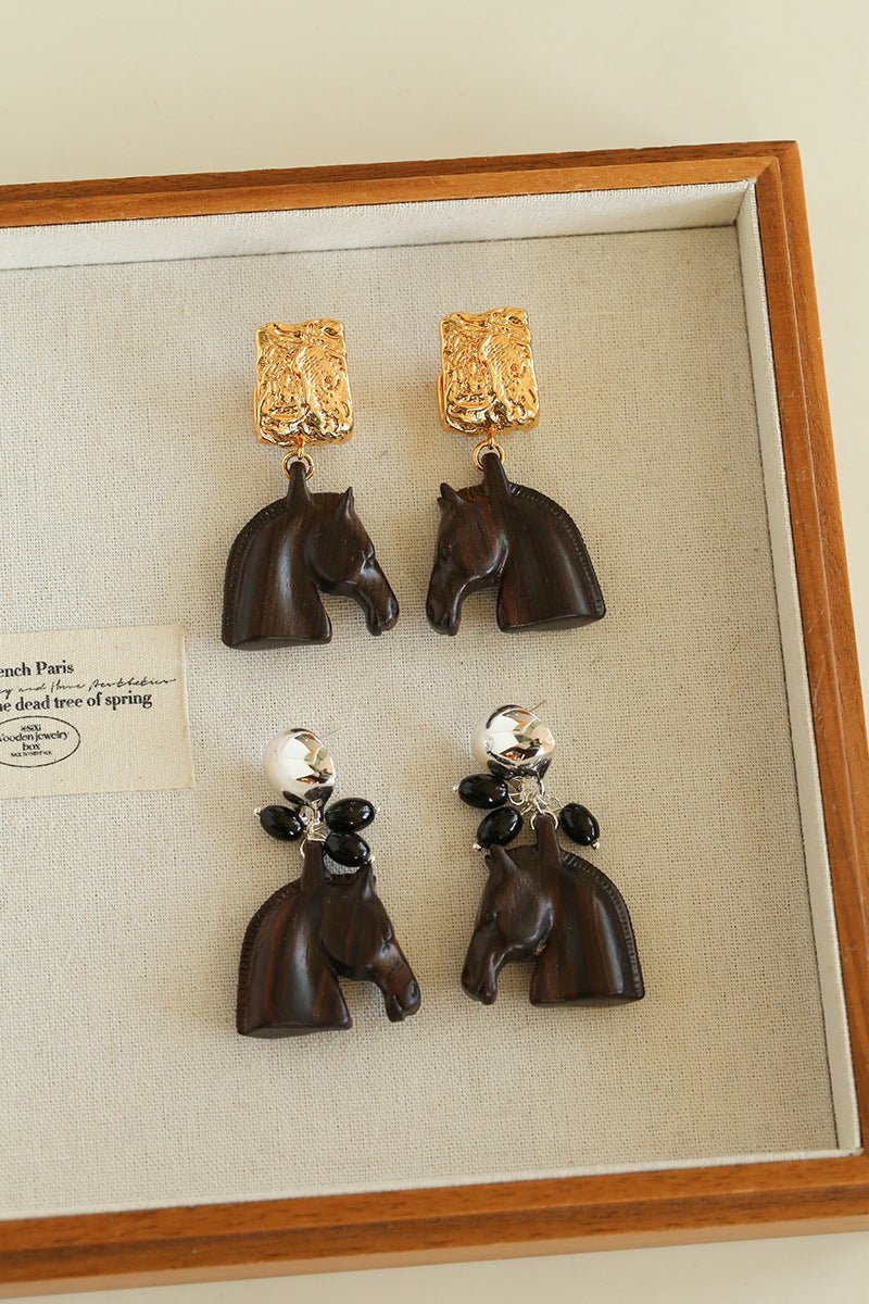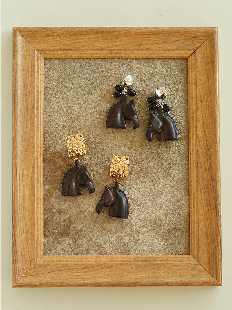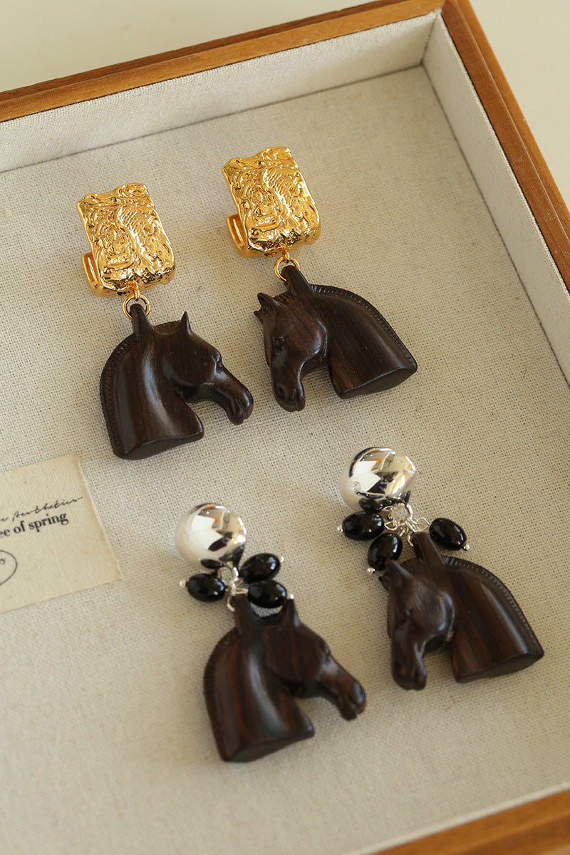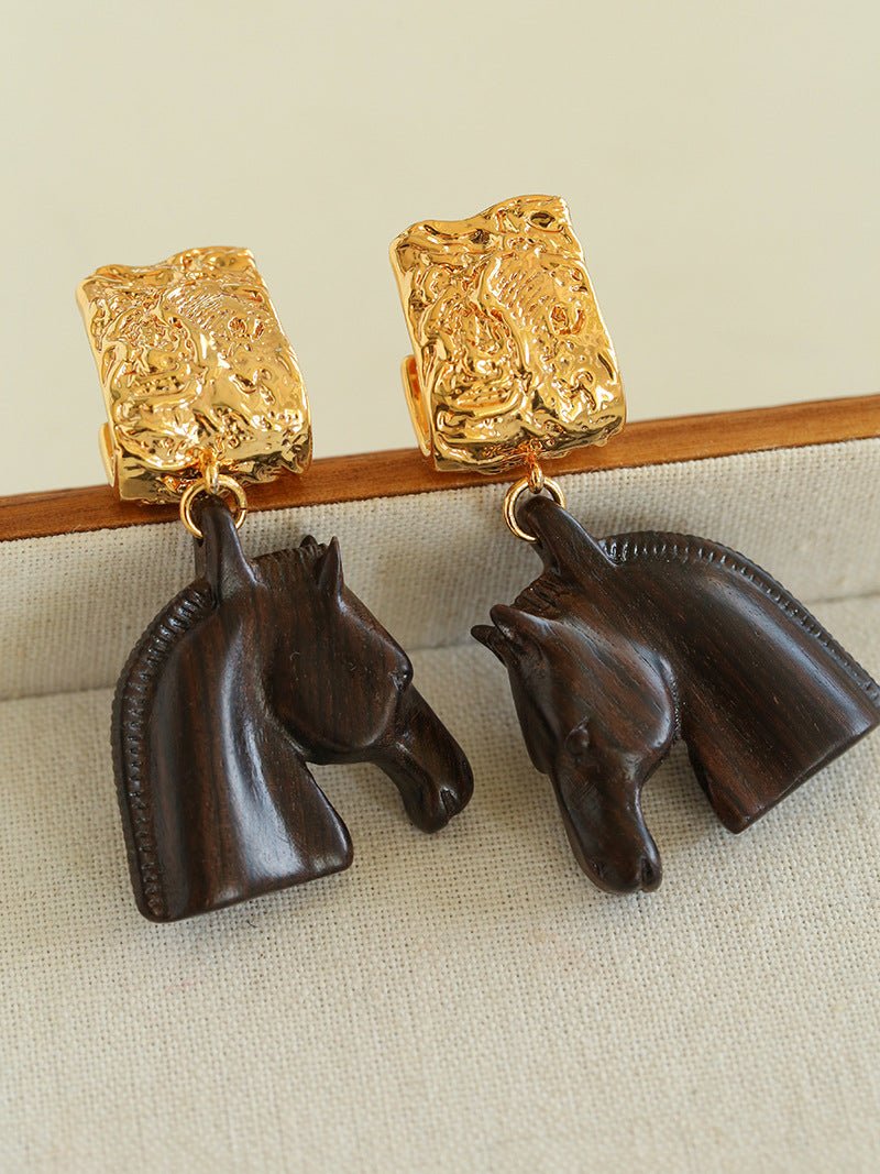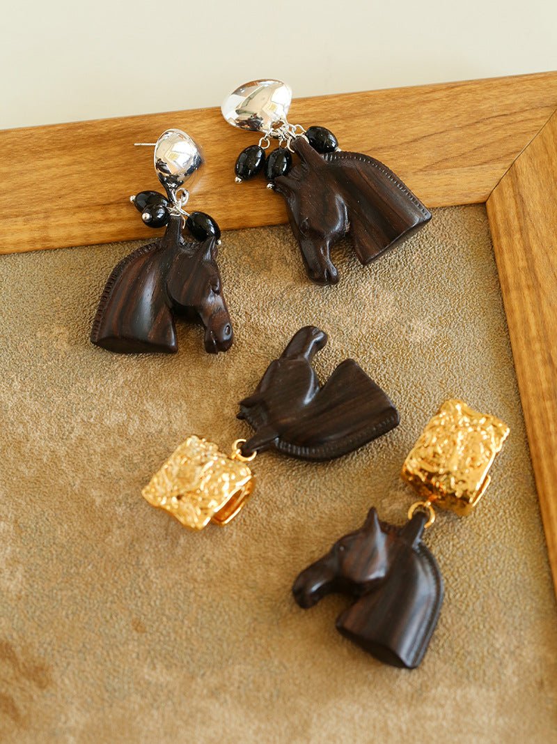 The horse head is hand-carved from natural ebony wood,revealing deep,organic textures that feel raw and timeless. Paired with lava-textured metal elements, the design balances rugged energy with refined craftsmanship.