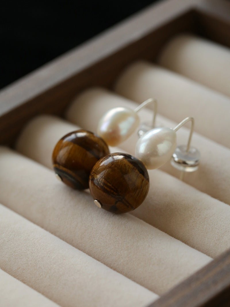 A pair of earrings that blends emotion, elegance, and individuality.Featuring 14mm natural gemstone beads paired with freshwater pearls, each variation tells its own story: Red Agate – bold, radiant, and flattering; Black Agate – cool, refined, and timeless; Tiger Eye – energetic with a sense of strength; Clear Quartz – soft, pure, and ethereal.
