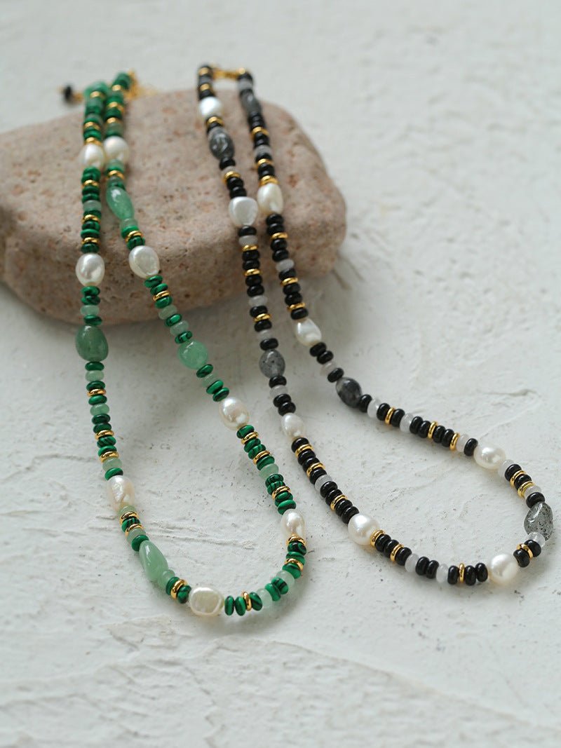 Introducing our Multiple Irregular Colored Agates Jade Necklace -Green. A captivating piece inspired by the diversity of nature, blending 18K gold plating with natural beauty. Versatile for both casual and formal occasions, this necklace adds a touch of opulence with its combination of colored stones and pearls in calming green hues.