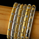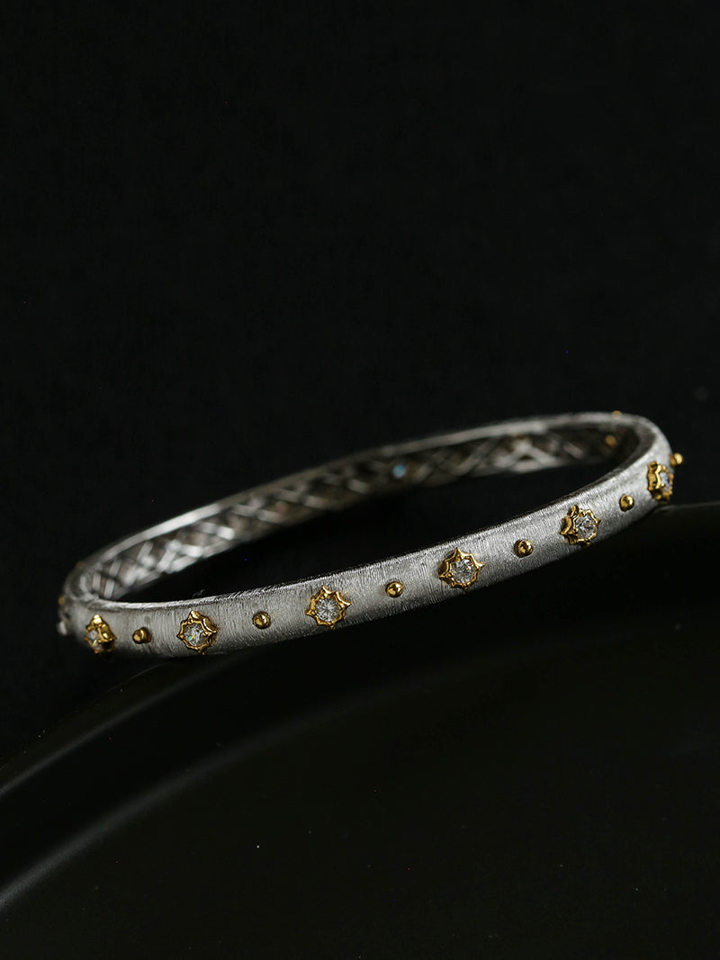 A delicate yet striking accessory, this narrow open cuff bracelet blends modern sophistication with celestial charm. Crafted from 925 sterling silver or gold-plated silver, its brushed finish catches the light beautifully, while hand-applied star motifs are accented with sparkling lab-created diamonds.