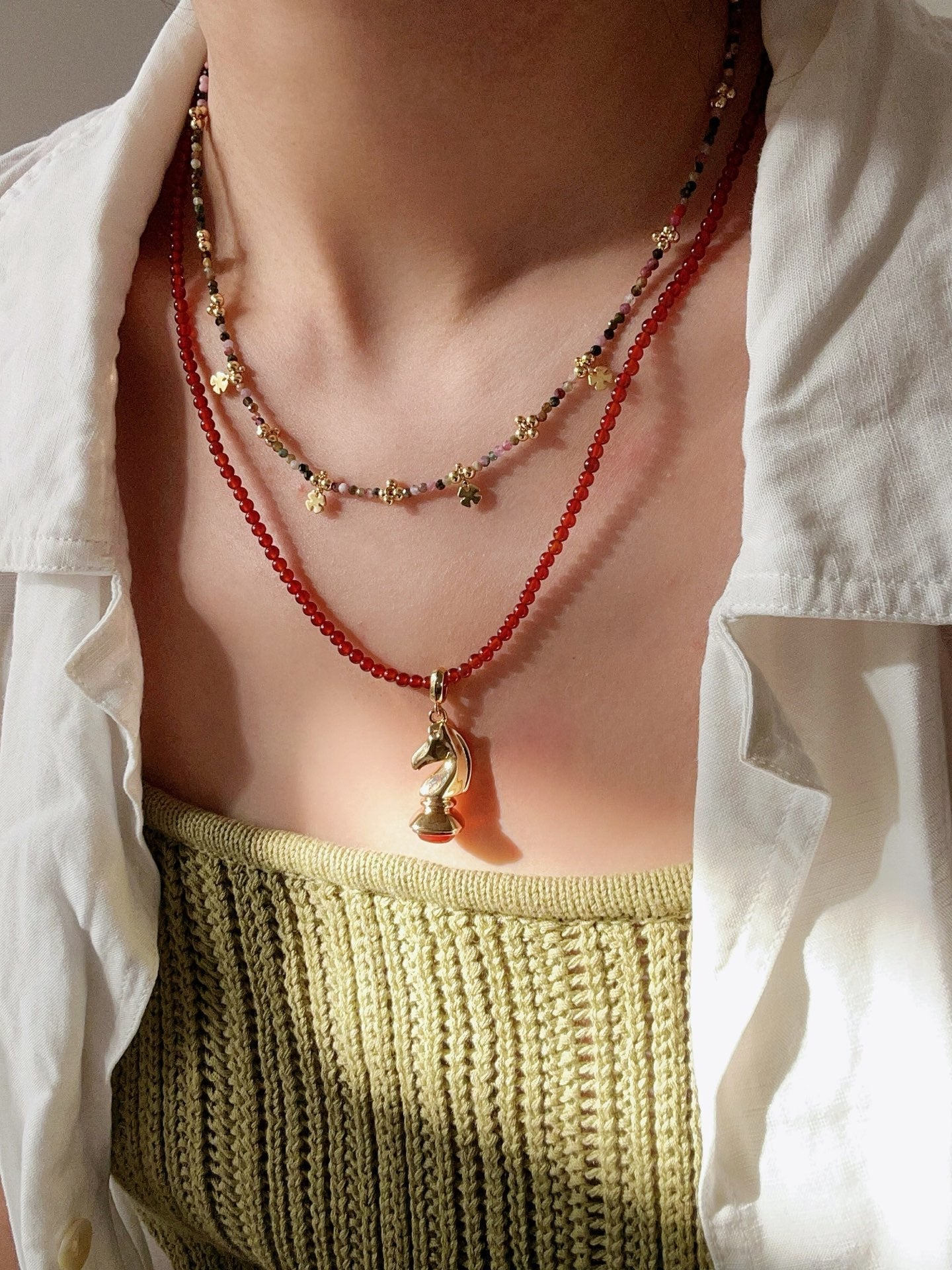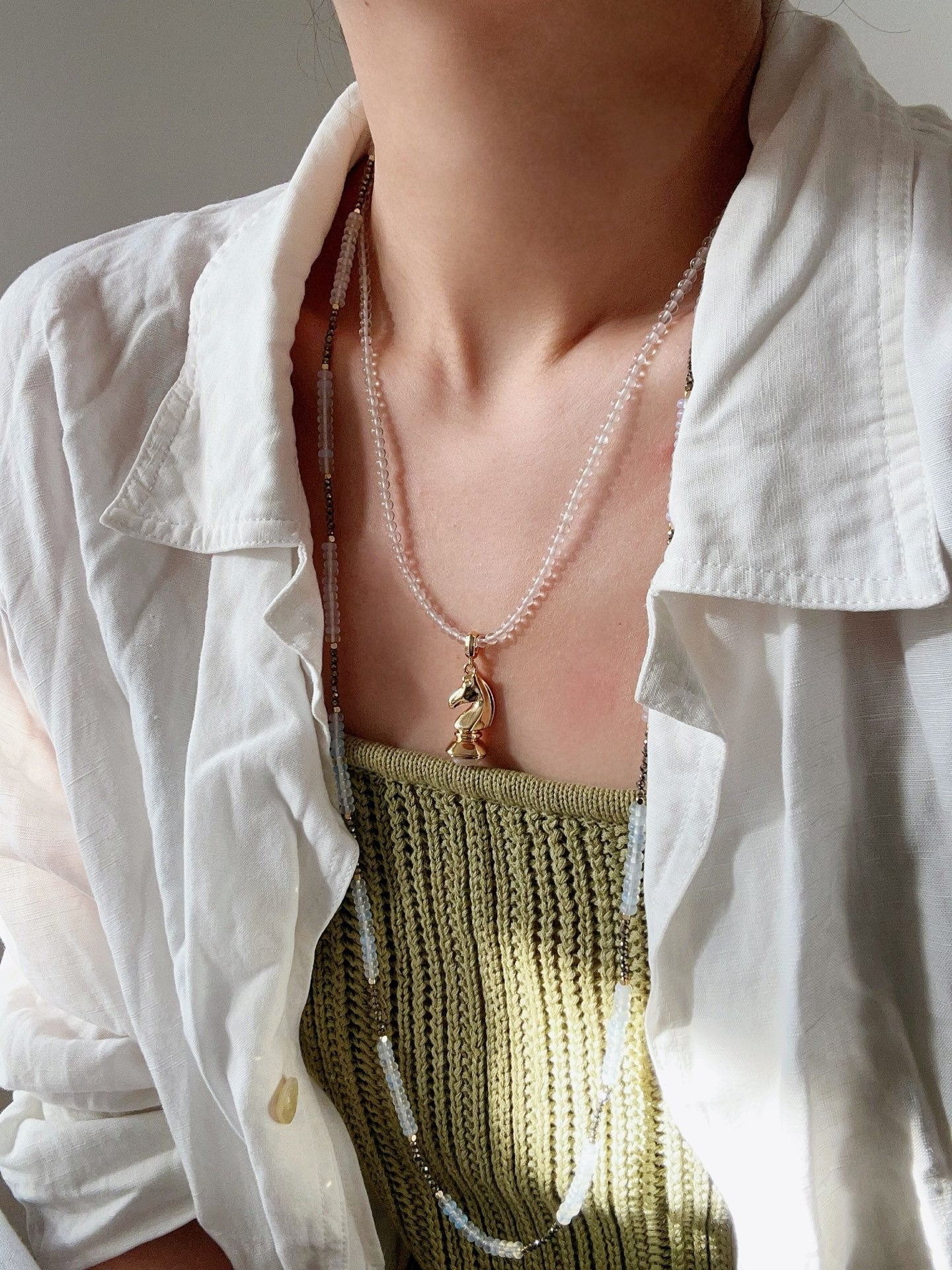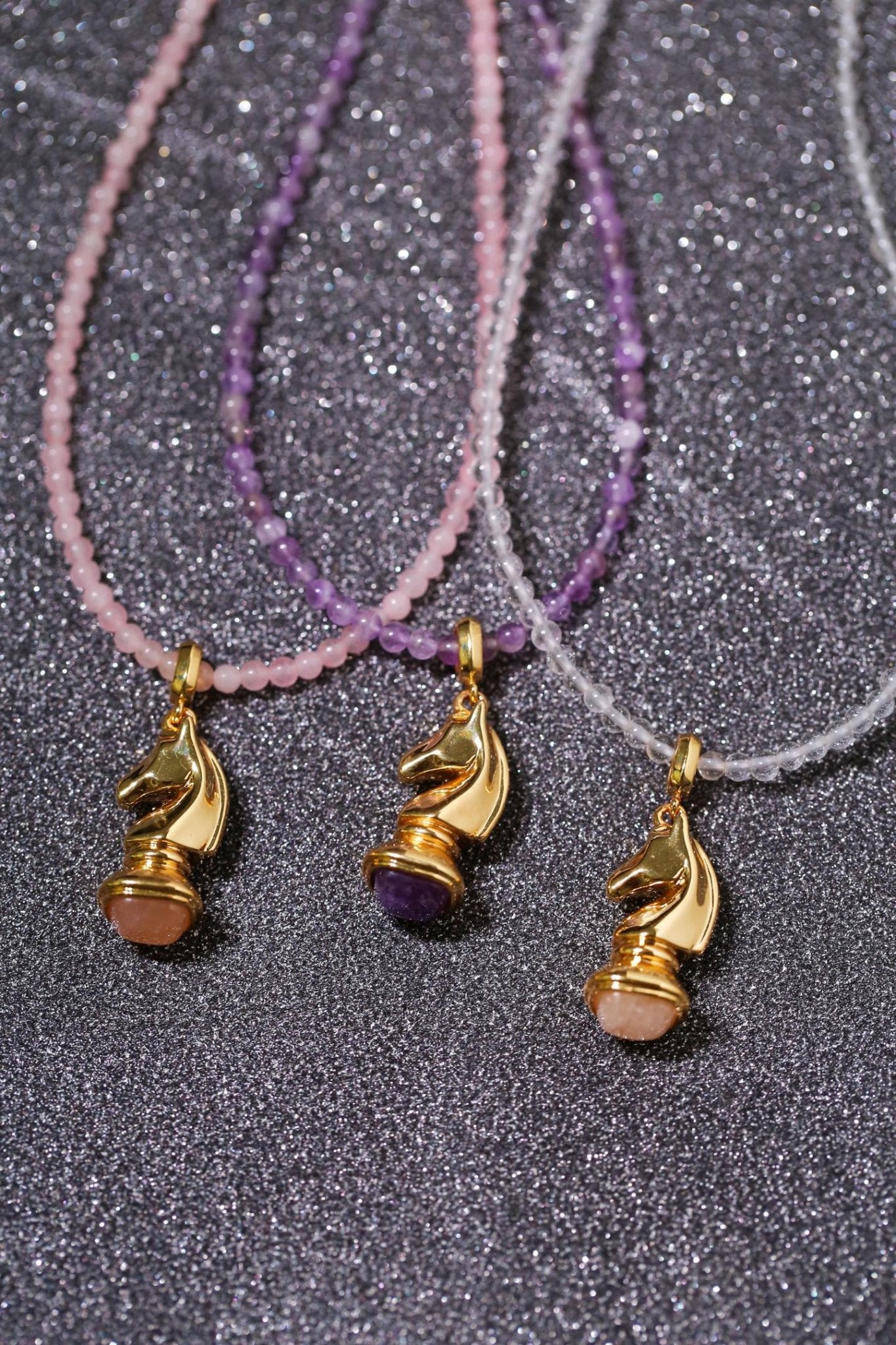 Inspired by the chess “Knight,” this necklace symbolizes courage, wisdom, and quiet strength.The horse-shaped pendant is sculpted with smooth, flowing metal lines, capturing the spirit of movement and determination. A natural gemstone is set beneath the horse, blending strength with softness—like a knight who protects what matters most.