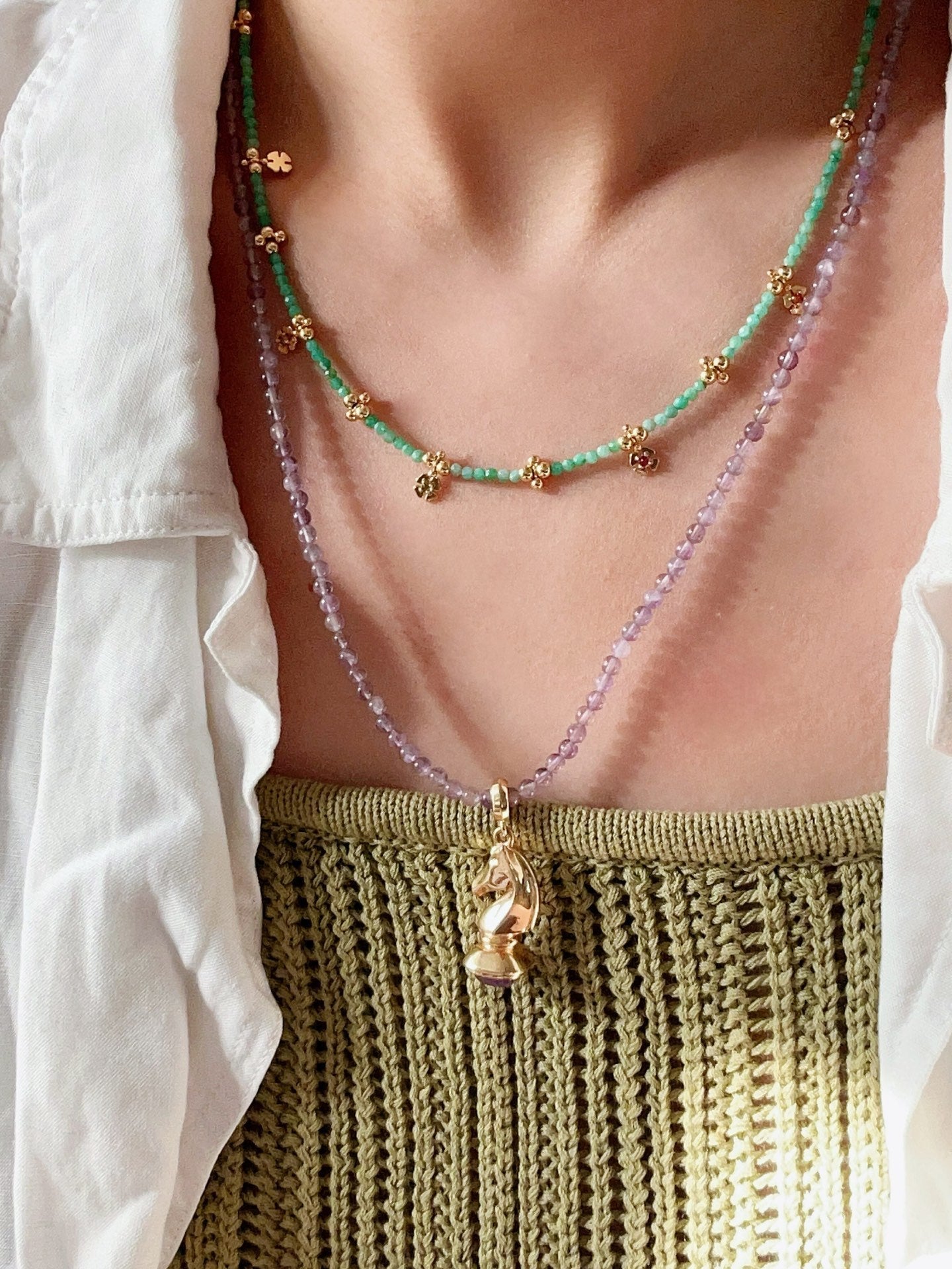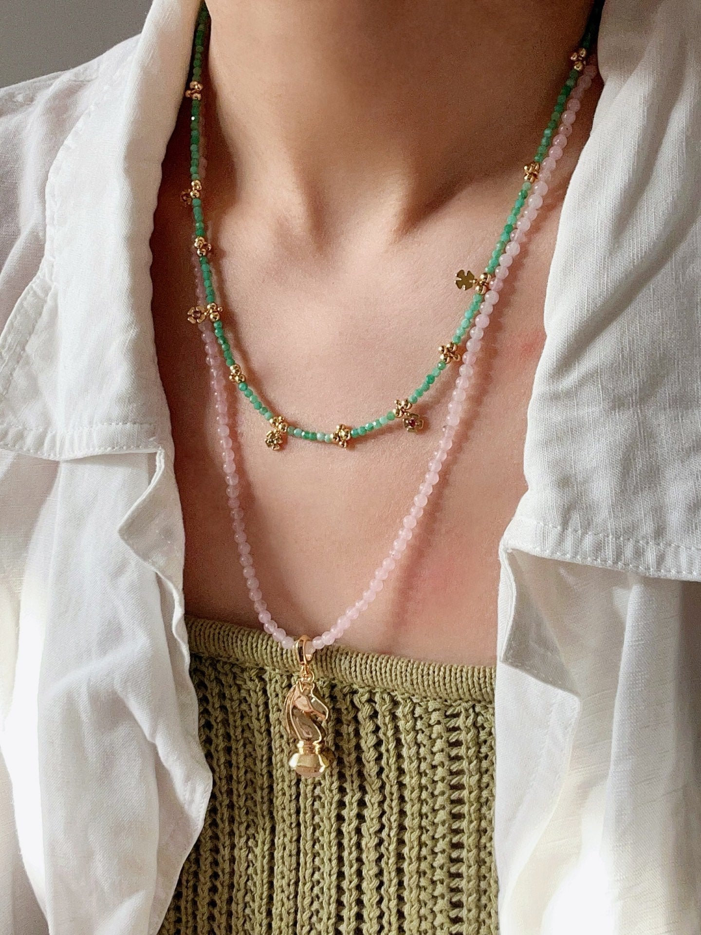 The necklace features color-matched natural gemstone beads, making it light, fresh, and perfect for spring and summer styling. Designed to sit elegantly along the collarbone, it looks refined worn alone and layered effortlessly with other pieces.
