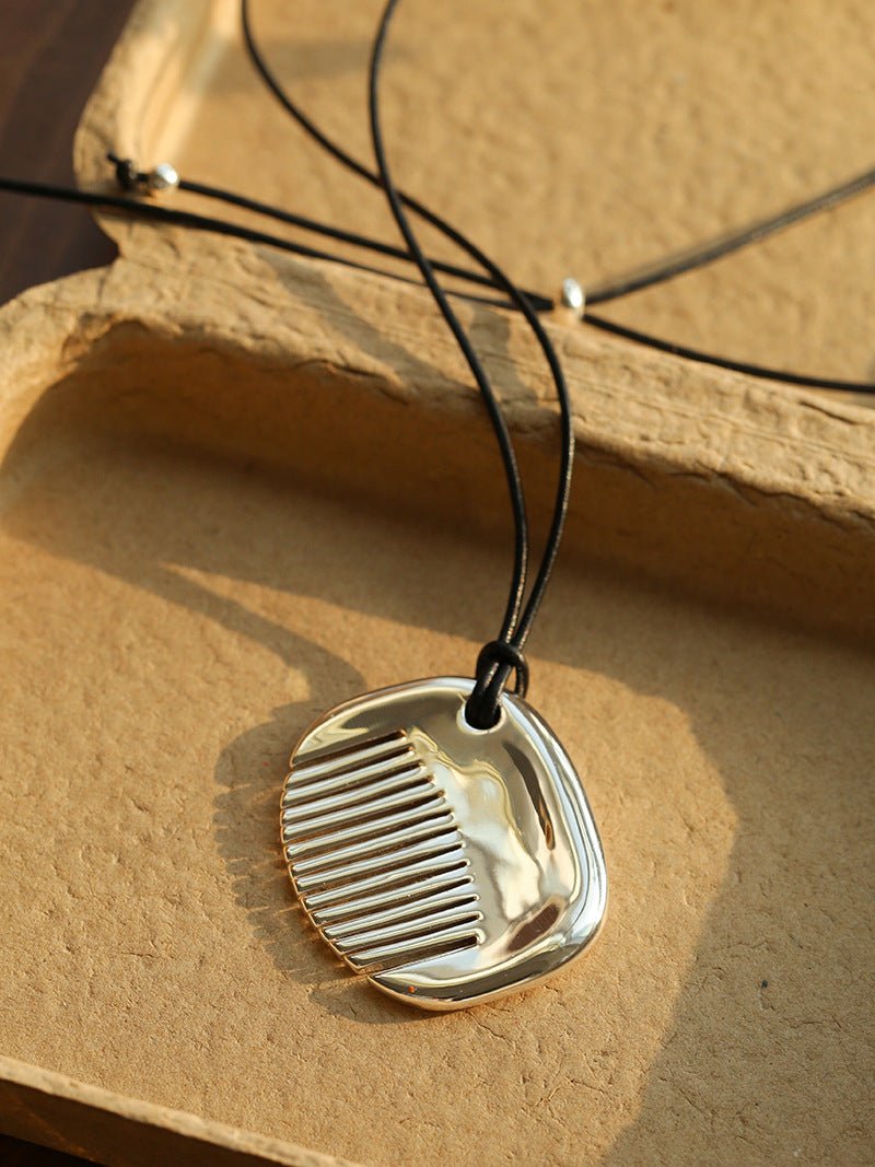 Minimal Silver Comb Pendant Leather Necklace