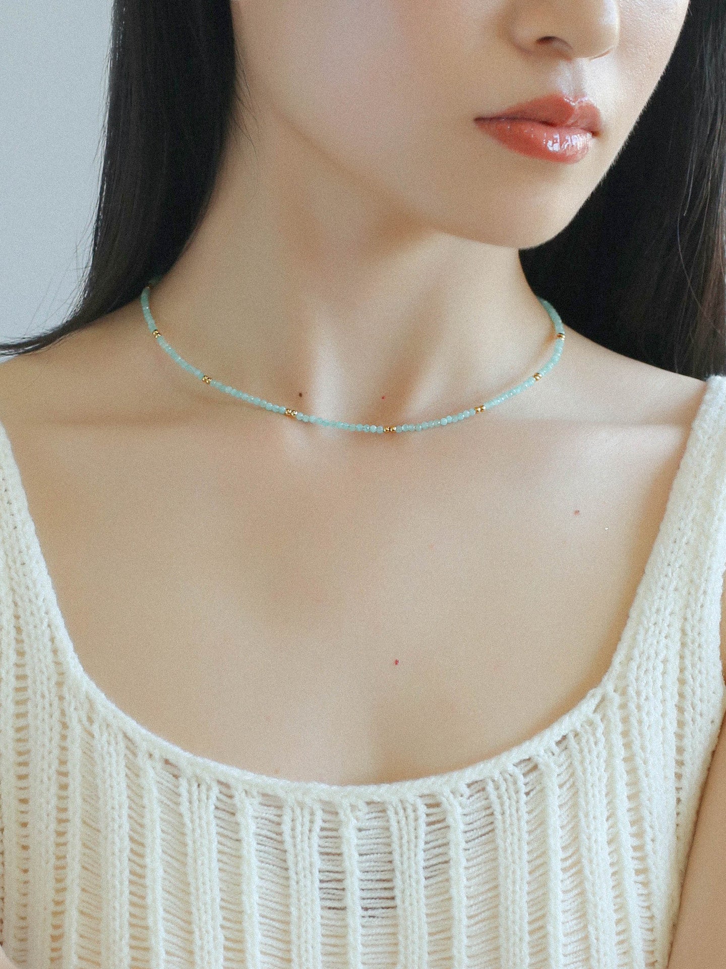 Crafted with exquisite Amazonite gemstones and delicately intertwined with shimmering gold beans, this necklace exudes elegance and sophistication. Elevate your look with its subtle yet striking beauty, perfect for any occasion. Whether worn alone or layered with other pieces, this necklace is sure to make a statement wherever you go.