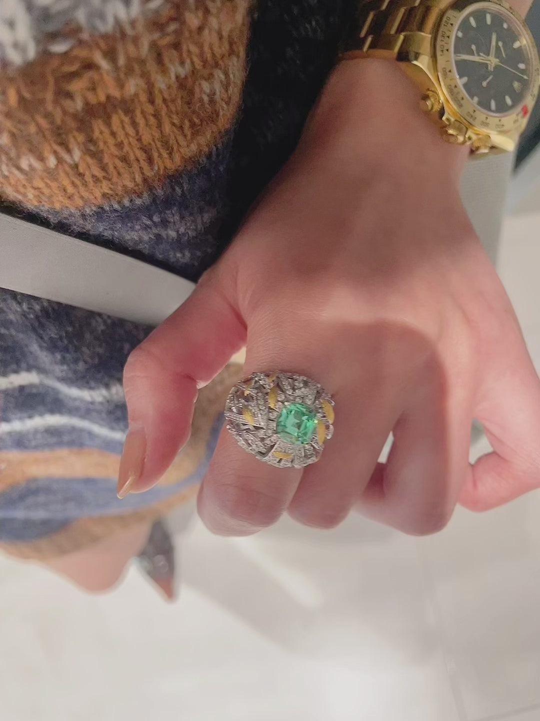 The ring shank features layered botanical motifs, adorned with high-brilliance stones and accented with gold brushed elements, creating an elevated depth and luxurious presence.