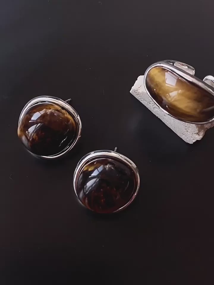 These classic Tiger’s Eye stud earrings capture the raw, untamed beauty of natural stone. The flowing golden-brown striations create a powerful, almost primal presence—bold yet effortlessly refined.