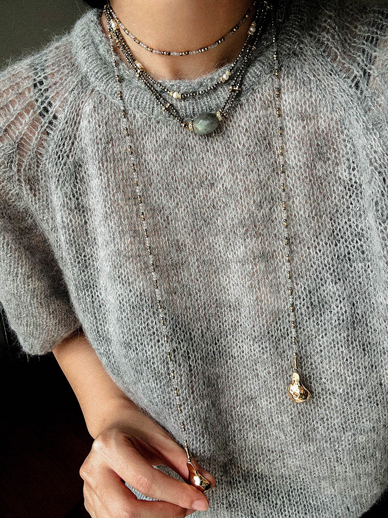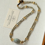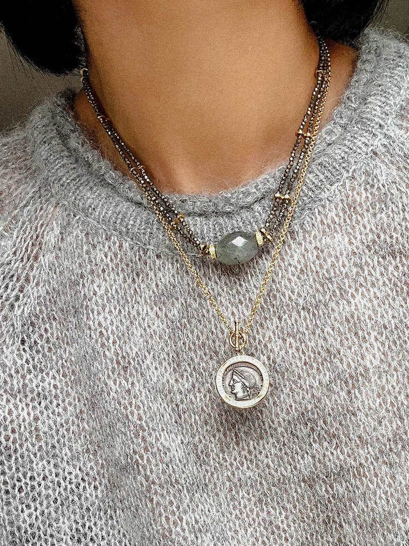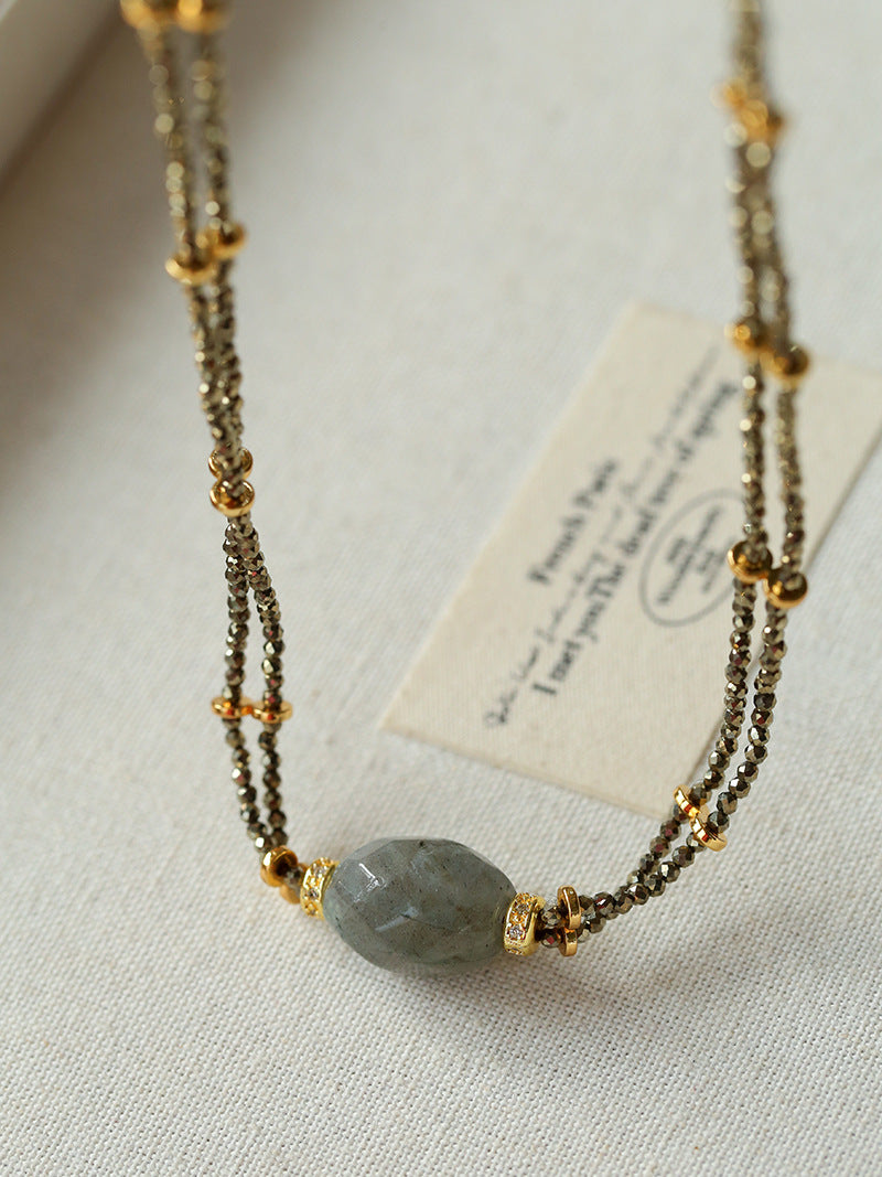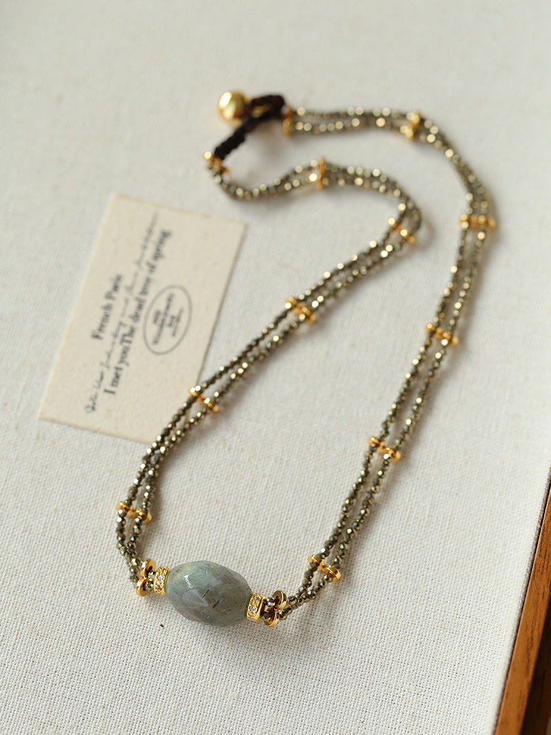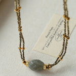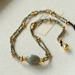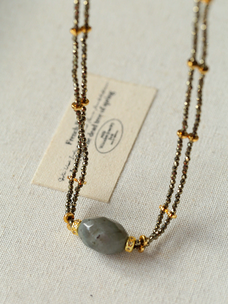 A bold expression of French vintage artistry — this double-layer necklace features a unique gold ore texture paired with a mystical labradorite gemstone that shimmers like a piece of the galaxy. The rugged metallic finish contrasts beautifully with the gemstone’s ethereal glow, creating a balance of raw strength and mysterious charm.
