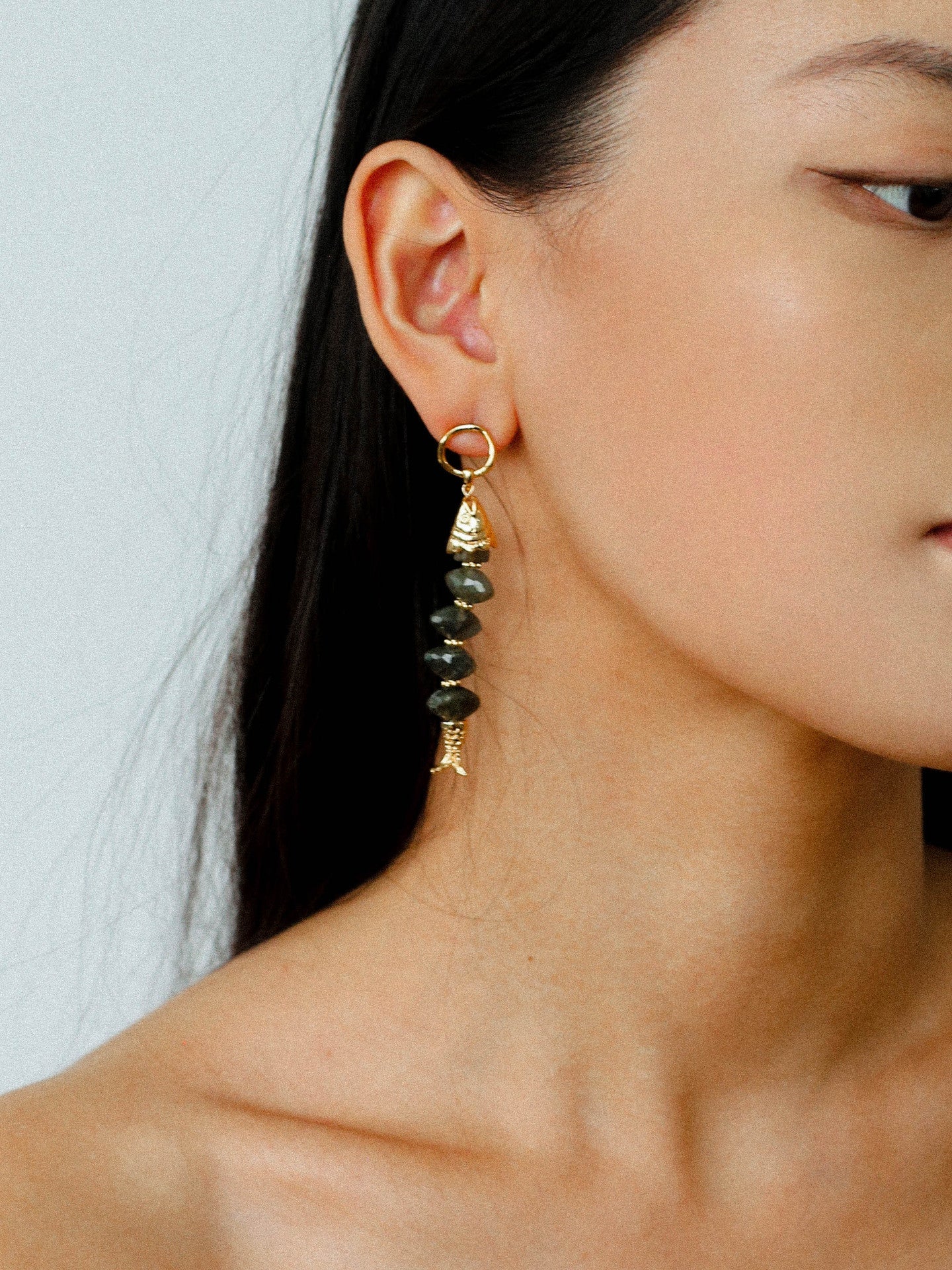 Inspired by the legends of deep-sea mermaids, these handcrafted earrings feature a playful fish design with a copper base plated in gold.