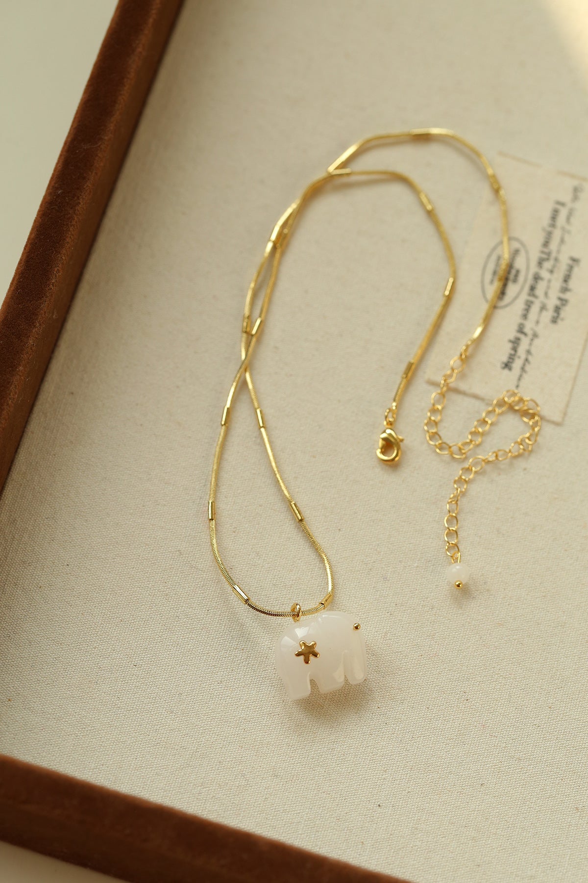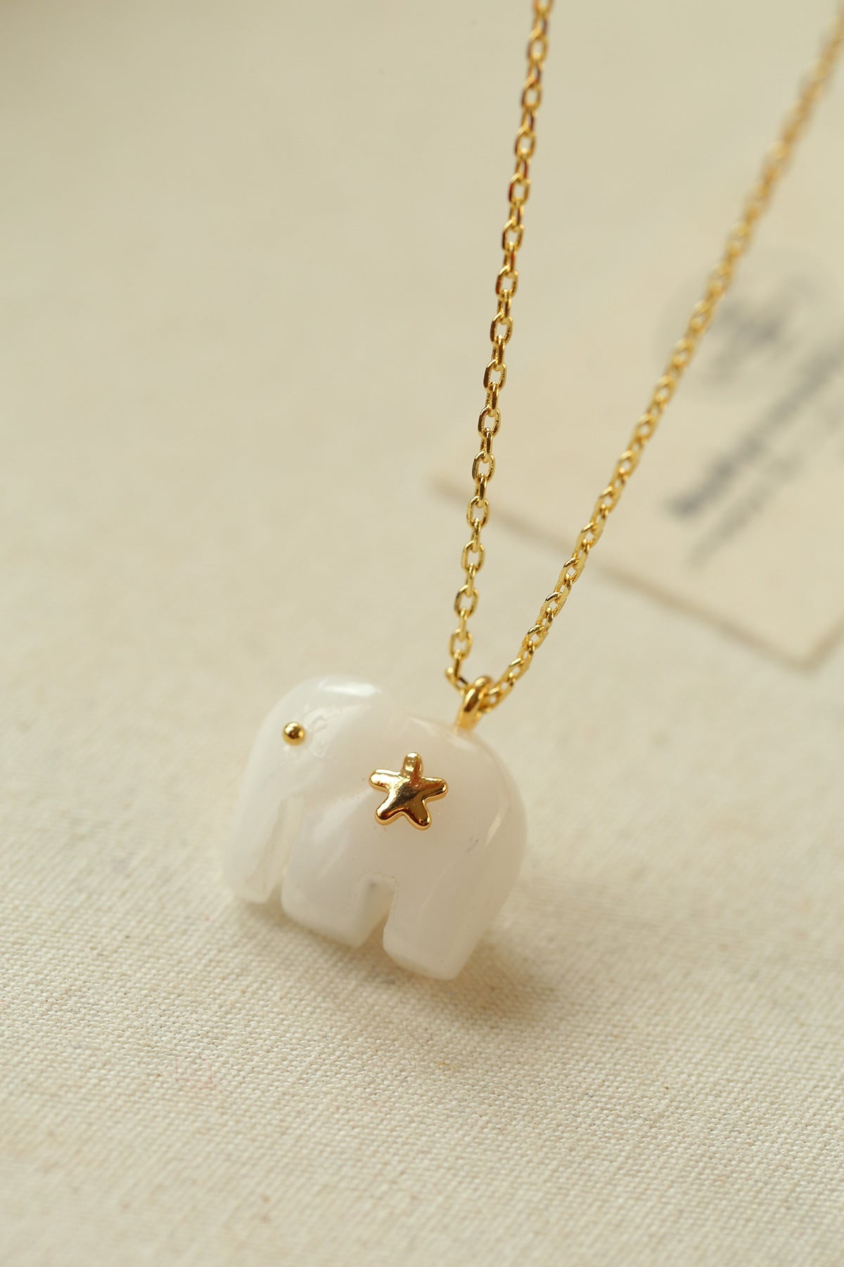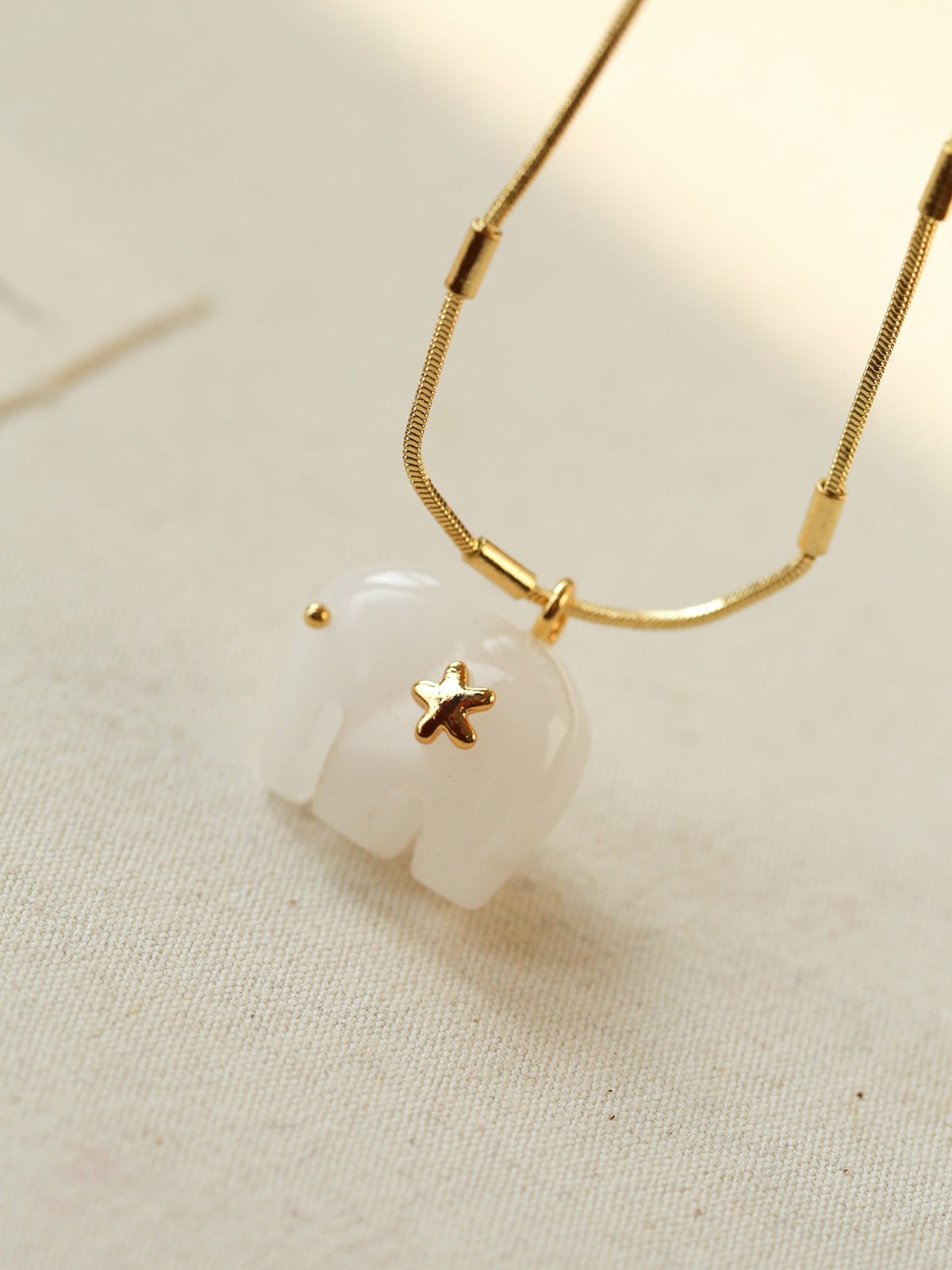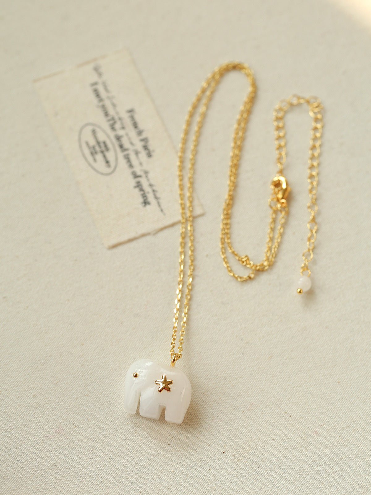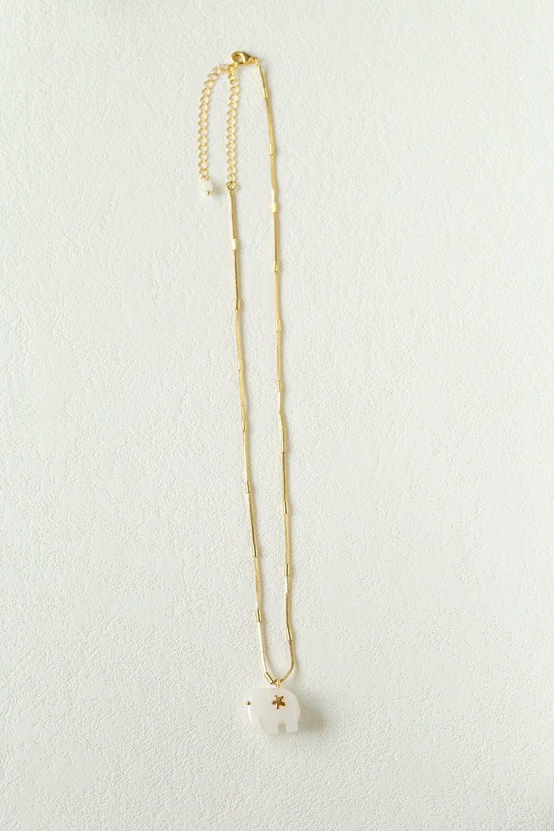Hand-carved from natural white jade, the elephant pendant symbolizes luck, wisdom, and protection. The smooth texture of jade brings a calm yet powerful presence, beautifully contrasted with 18K gold-plated brass chains.Wear it alone for a minimalist statement or layer it with colorful gemstone necklaces for a true boho-inspired look.