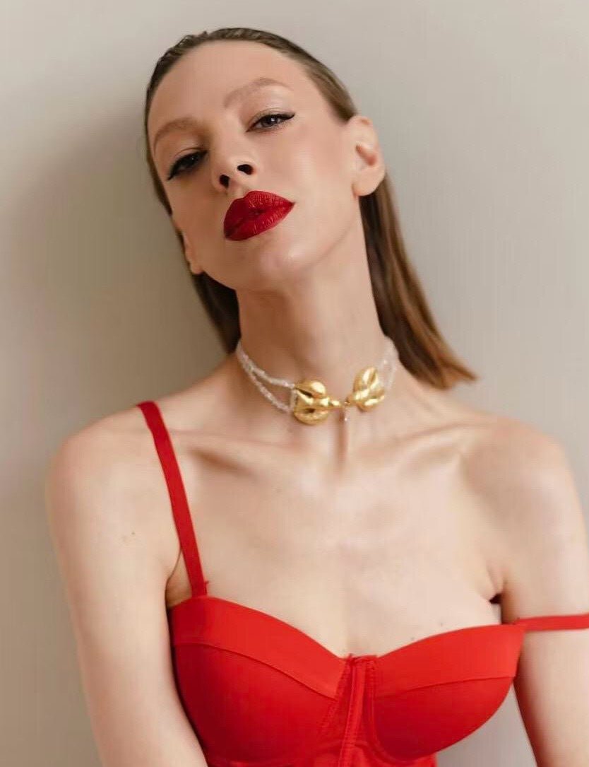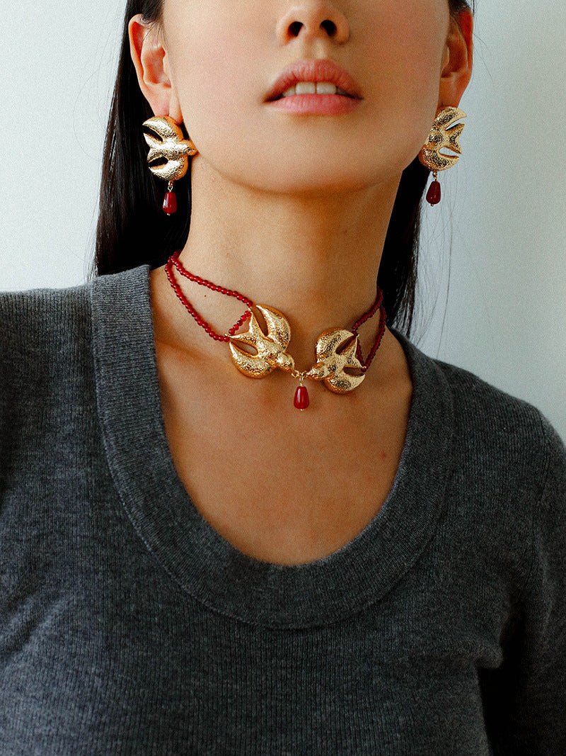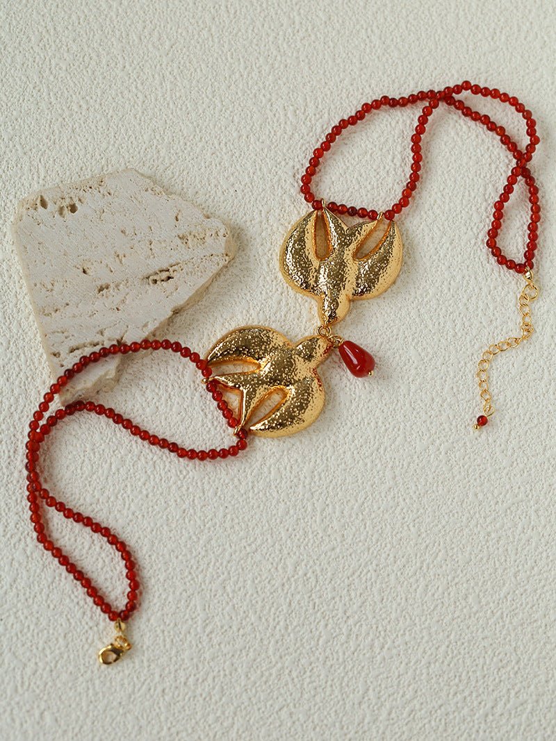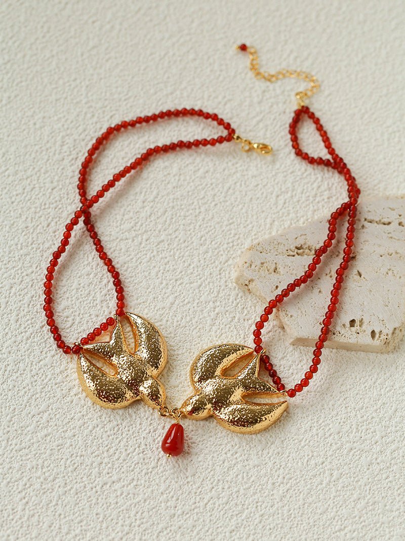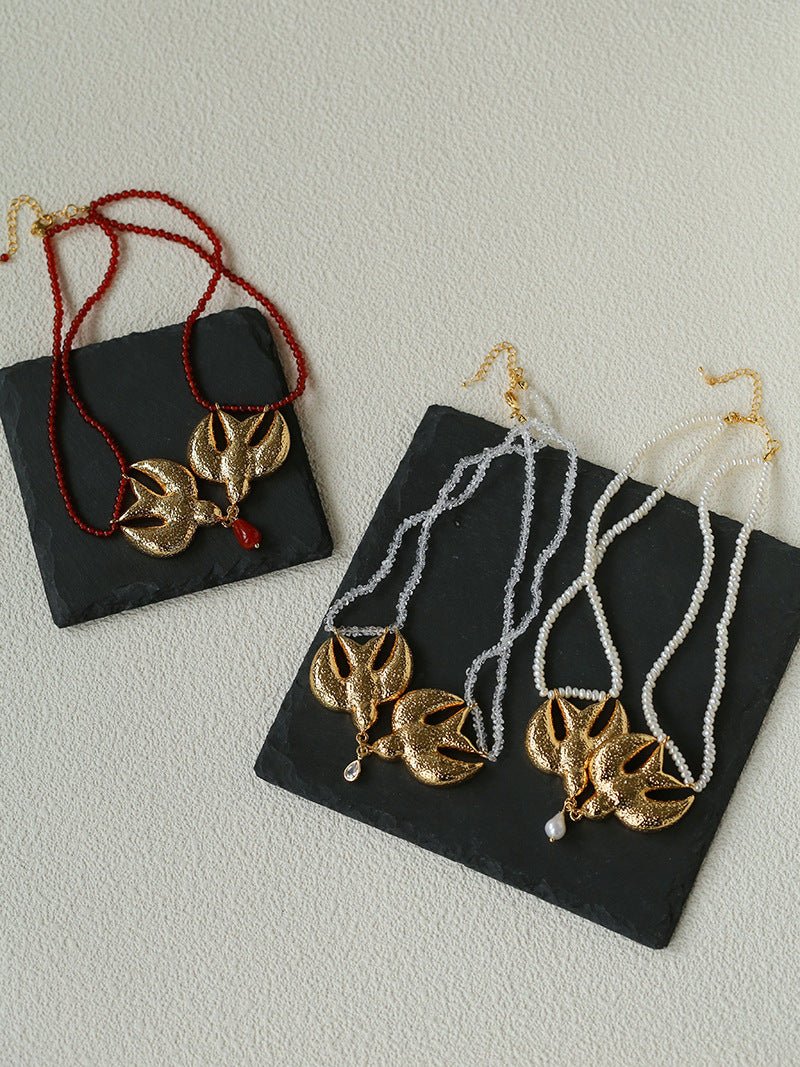 Two doves face each other across delicate mini bead strands, highlighting the collarbone and creating elegant layers.Adorned with faceted glass beads, warm red agate, and natural freshwater pearls, the necklace exudes refined texture and subtle charm.