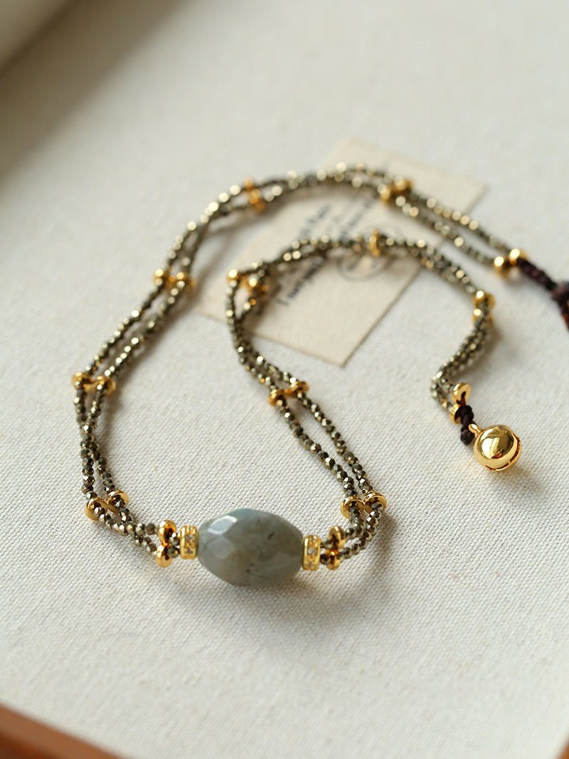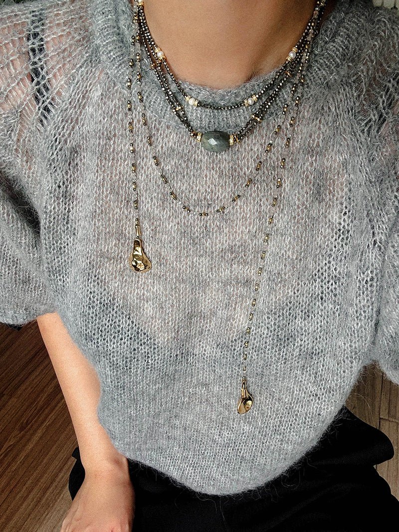 A bold expression of French vintage artistry — this double-layer necklace features a unique gold ore texture paired with a mystical labradorite gemstone that shimmers like a piece of the galaxy. The rugged metallic finish contrasts beautifully with the gemstone’s ethereal glow, creating a balance of raw strength and mysterious charm.