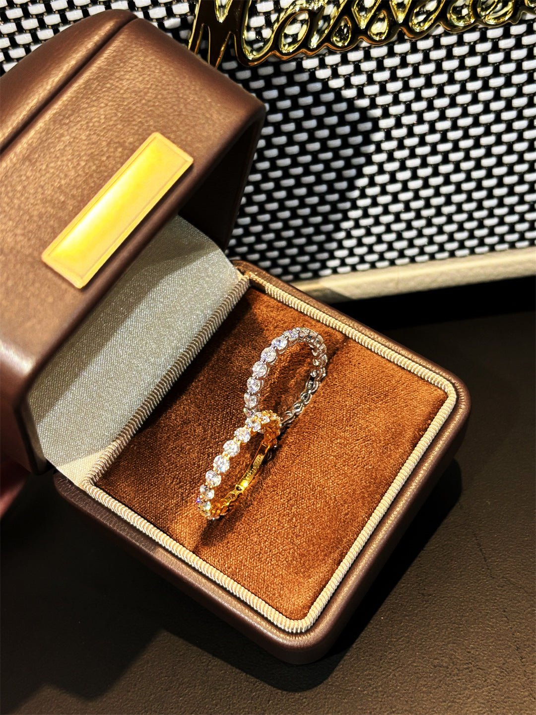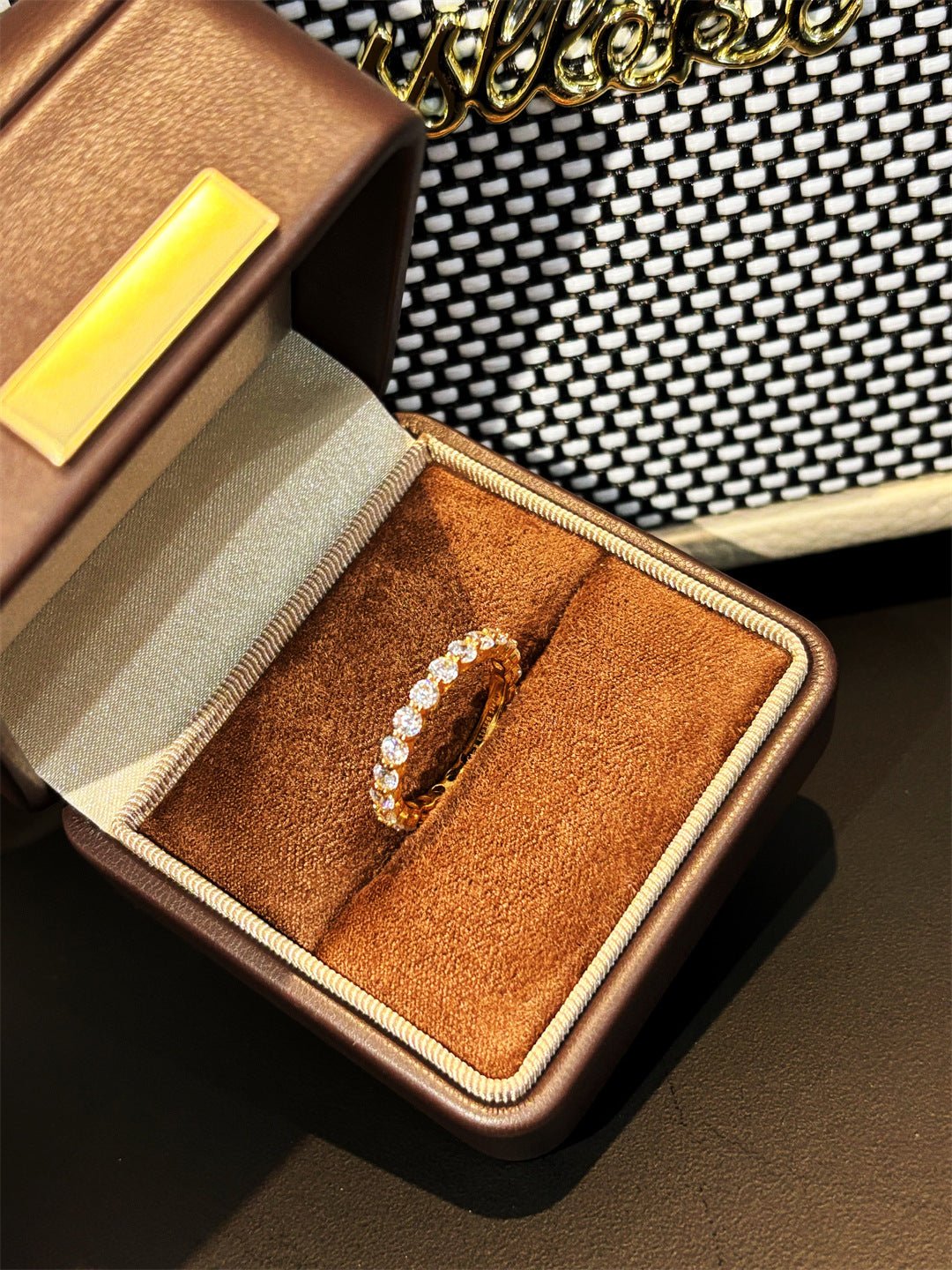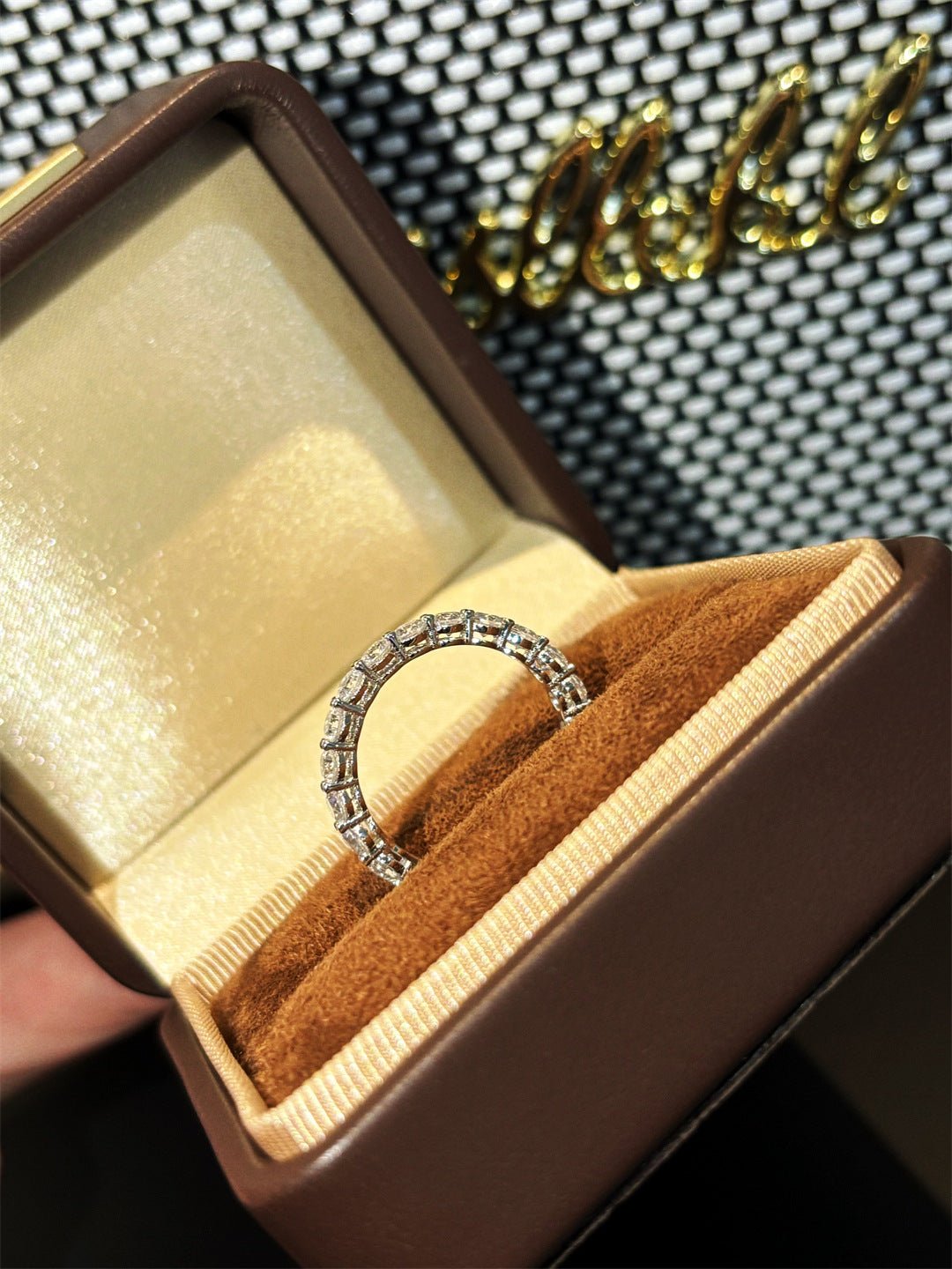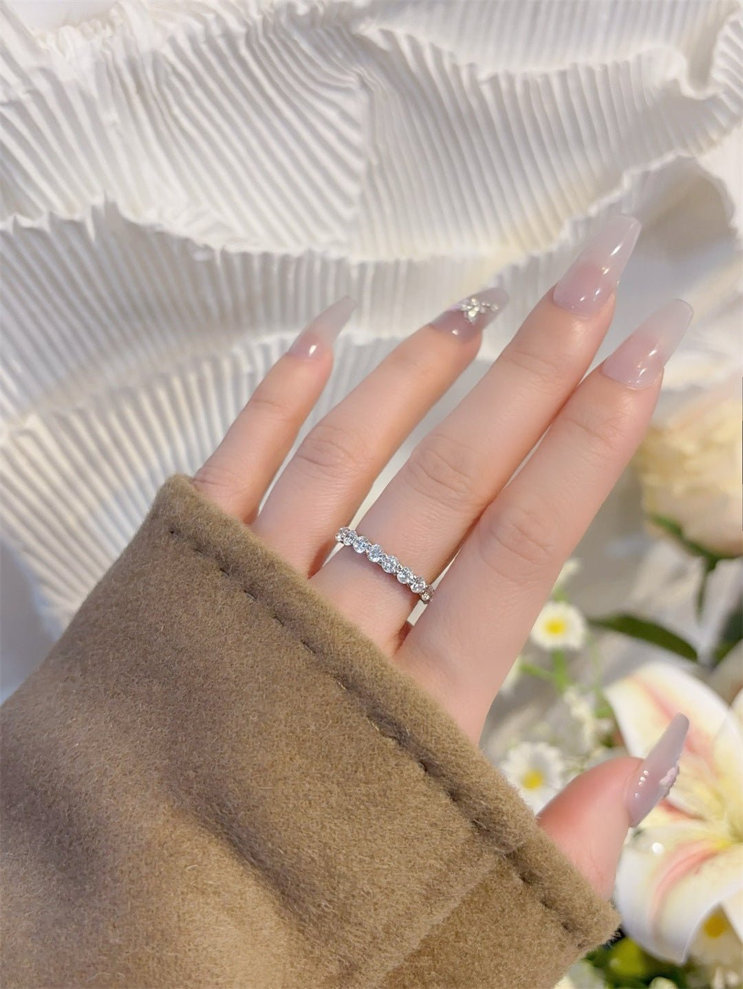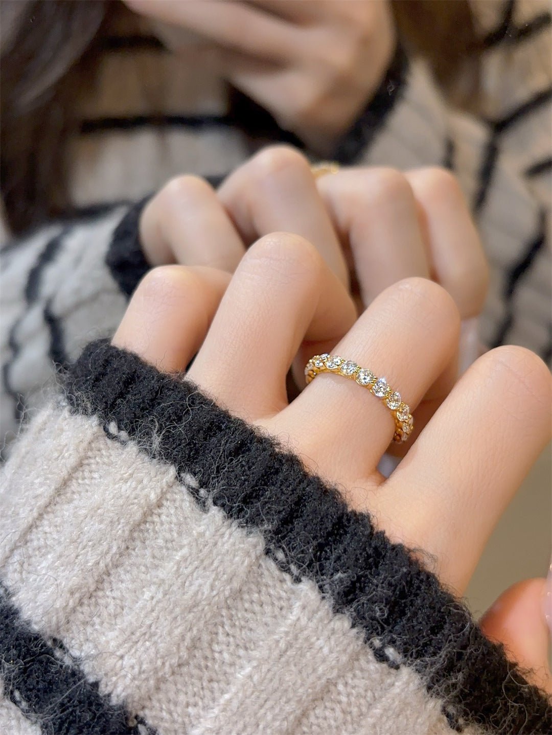 A full eternity band set with 10pt small diamonds, sparkling and luminous, with delicate prong settings to maximize light reflection for a luxurious look. Crafted from hypoallergenic 925 sterling silver, available in gold or white gold plating for a refined finish.