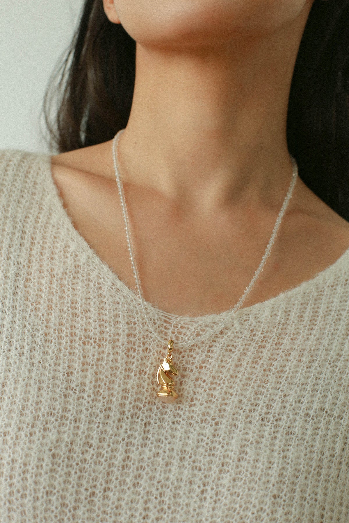 Inspired by the chess “Knight,” this necklace symbolizes courage, wisdom, and quiet strength.The horse-shaped pendant is sculpted with smooth, flowing metal lines, capturing the spirit of movement and determination. A natural gemstone is set beneath the horse, blending strength with softness—like a knight who protects what matters most.