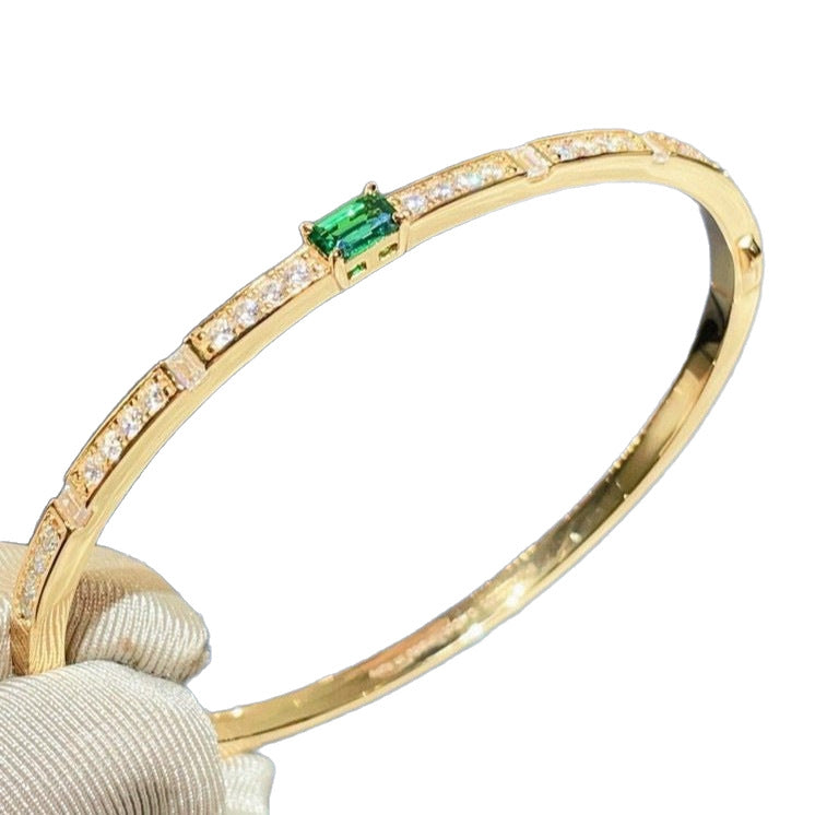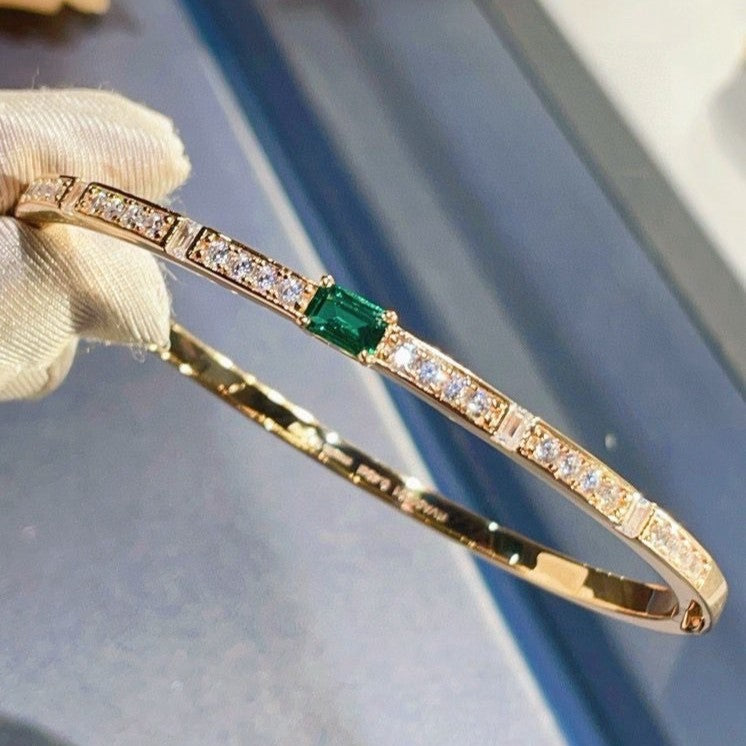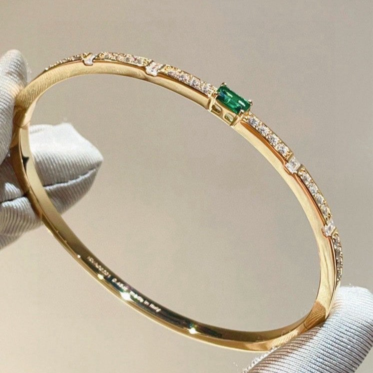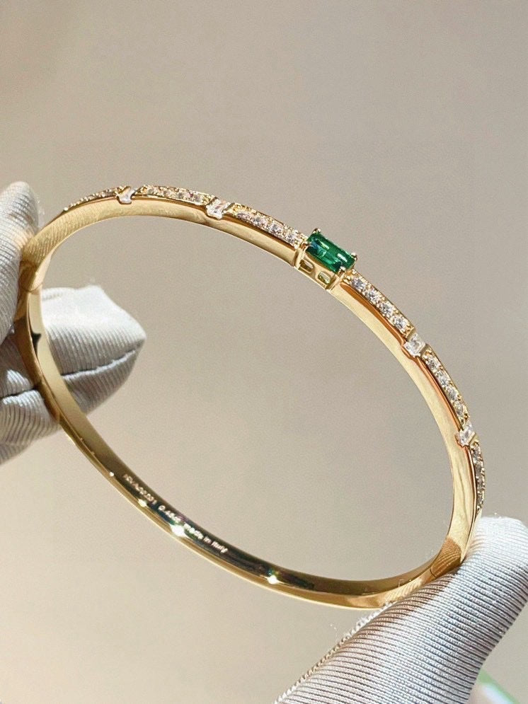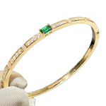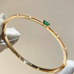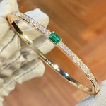 Crafted from premium S925 sterling silver with a luxurious gold plating, the bangle features a striking central lab-grown emerald, flanked by sparkling lab-grown diamonds set along the band. The clean, sleek silhouette balances bold gemstone accents with understated design, making it versatile enough for both formal events and daily wear.