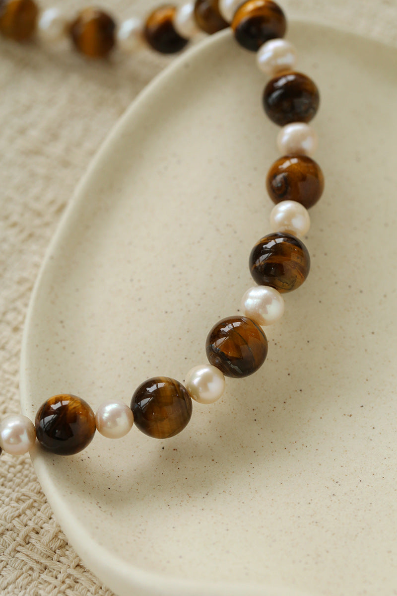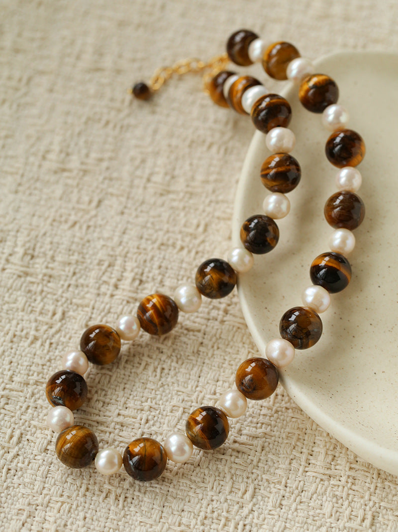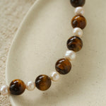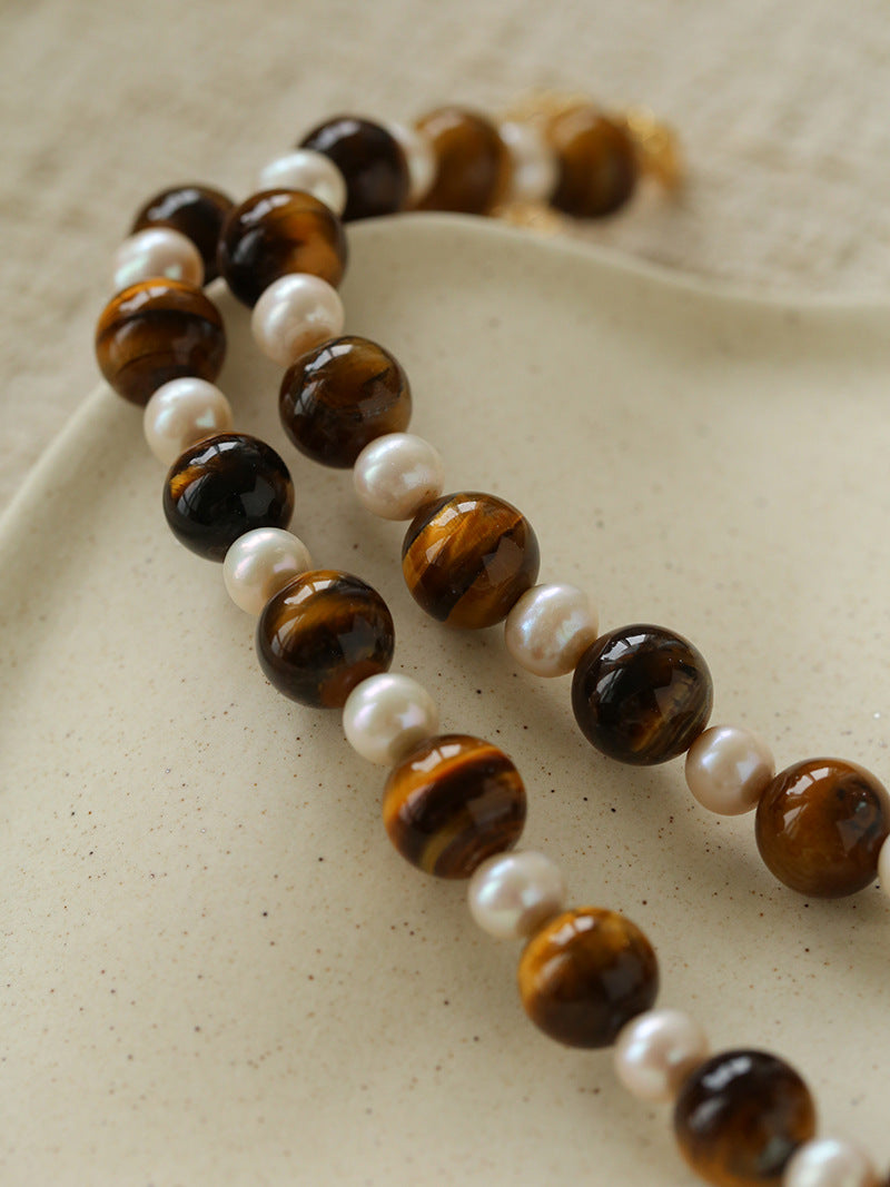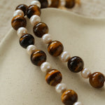 This necklace features bold tiger eye stones paired with delicate freshwater pearls, arranged in an alternating pattern that adds rhythm and visual depth. Each powerful tiger eye bead is softened by a luminous pearl, creating a harmonious blend of confidence and elegance.