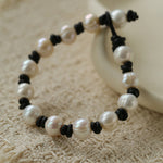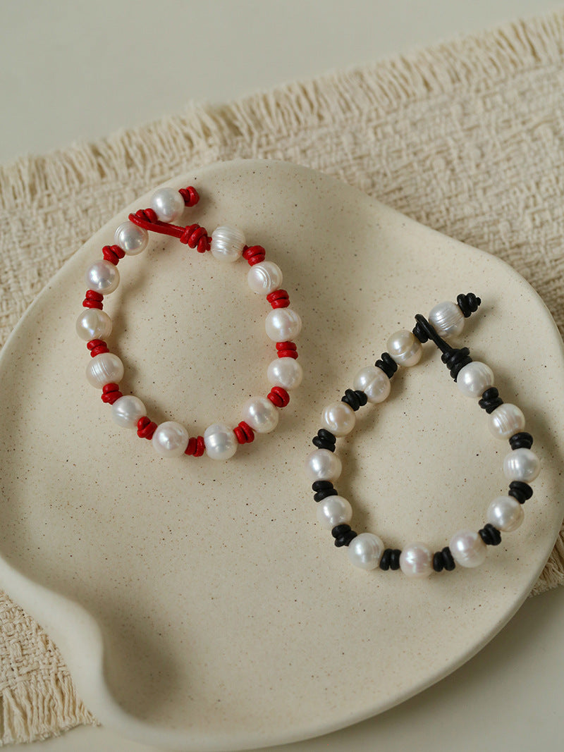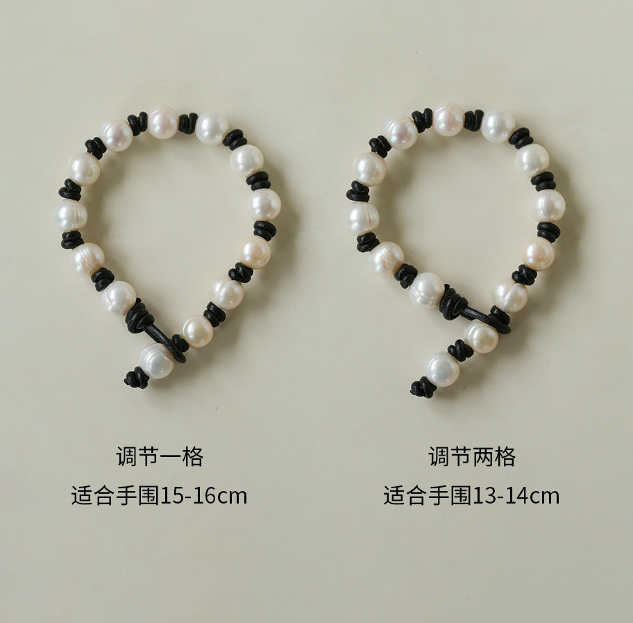 A relaxed bracelet crafted with natural freshwater pearls and hand-knotted leather cord. Each pearl carries its own organic texture and soft glow, giving the bracelet a raw yet elegant character.