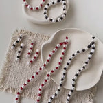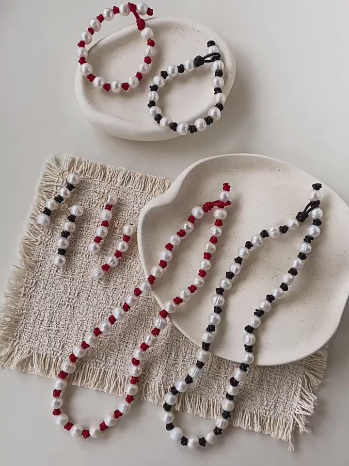 This necklace combines natural textured freshwater pearls with a knotted leather cord for a relaxed yet distinctive look. The organic pearl luster brings a soft glow, while the spaced knot design adds a unique handmade touch that feels effortlessly bohemian.