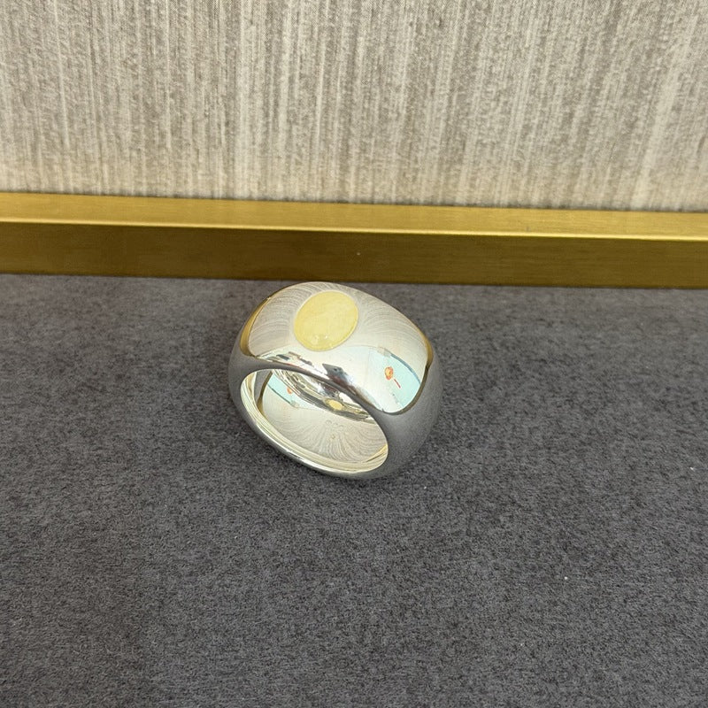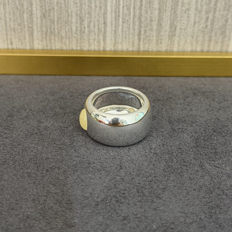 A bold, rounded wide band crafted from 925 sterling silver with a smooth, polished finish, centered by a natural light yellow jade stone. The warm, translucent jade brings an elegant, retro Eastern charm.
