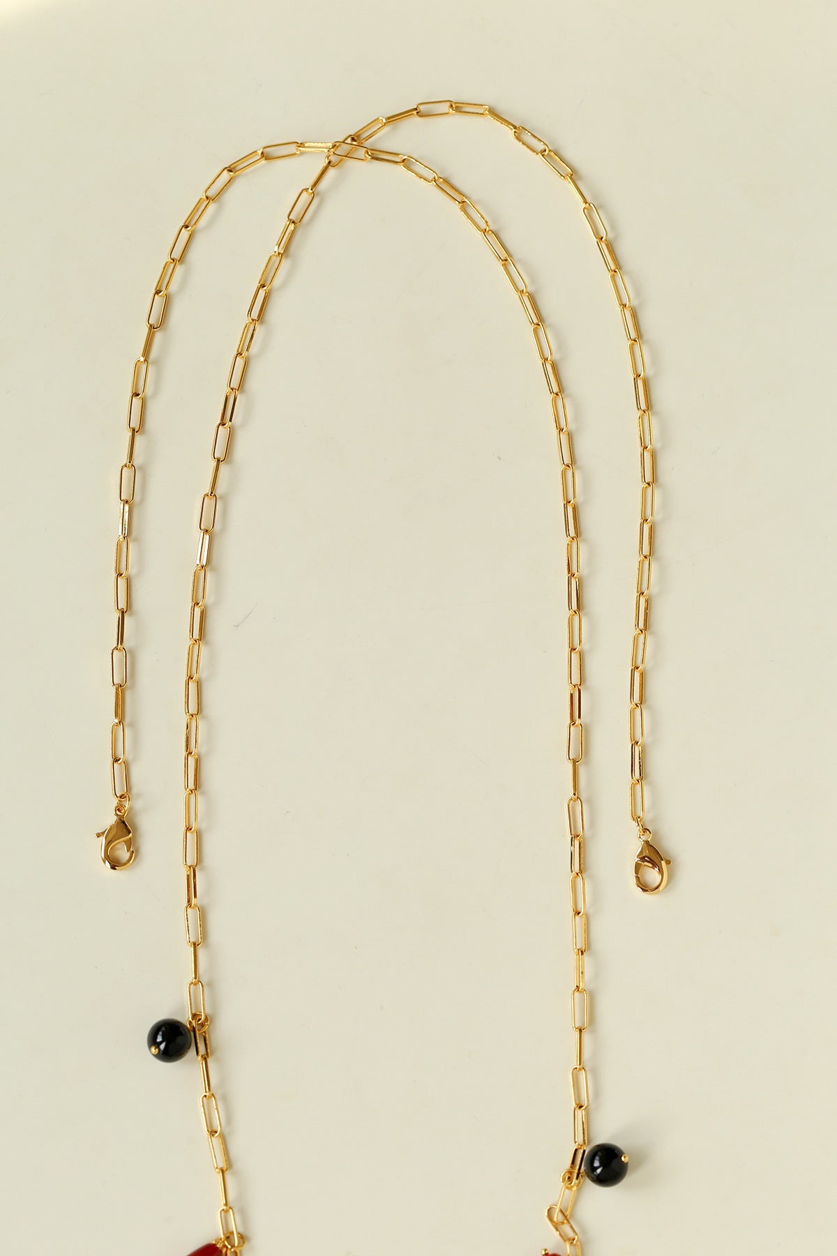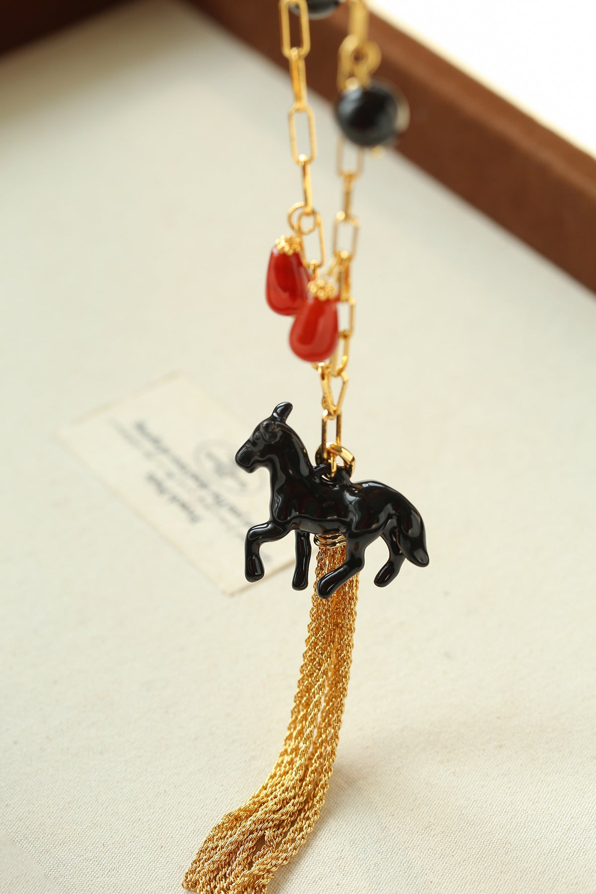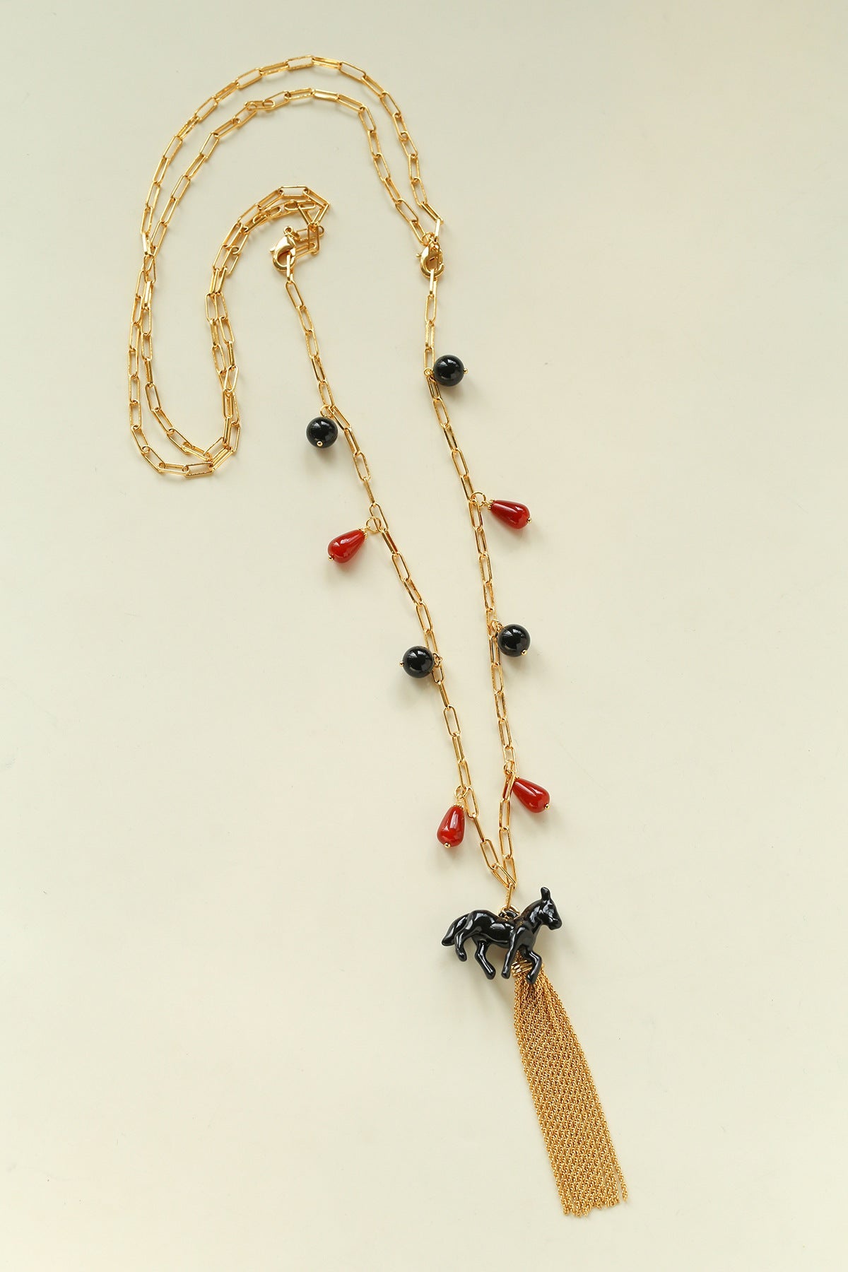 This original enamel horse tassel necklace features a sculpted 3D horse silhouette with refined enamel craftsmanship. The striking black and gold contrast delivers a mysterious vintage aesthetic with strong visual impact. Alternating red and black agate beads create a dramatic yet balanced color contrast — bold, powerful, and effortlessly chic.