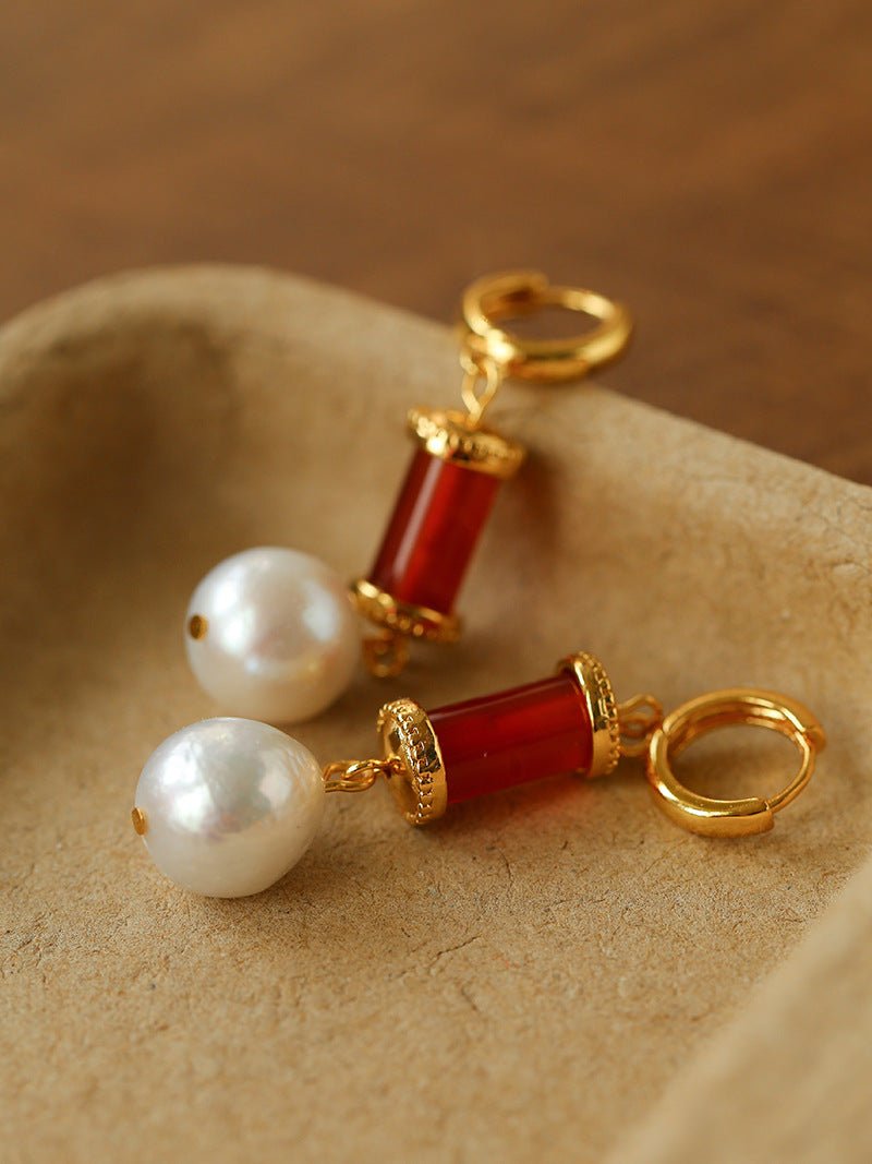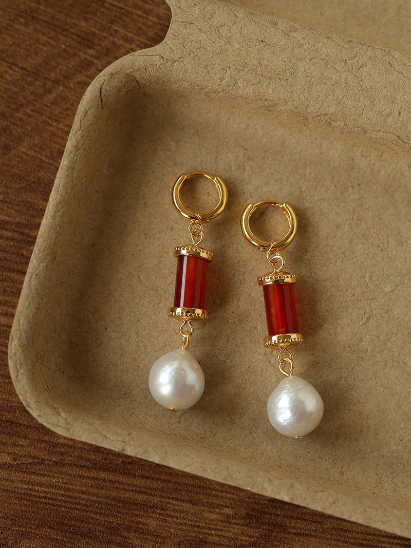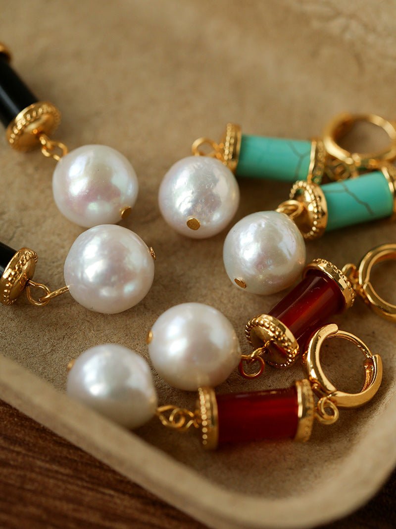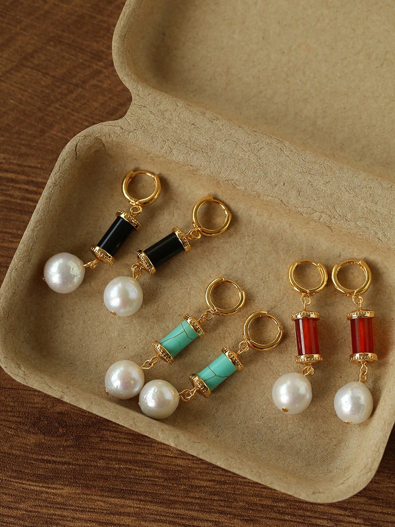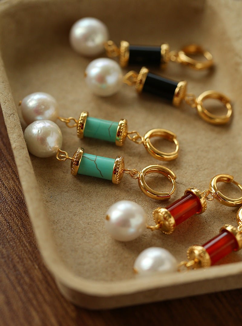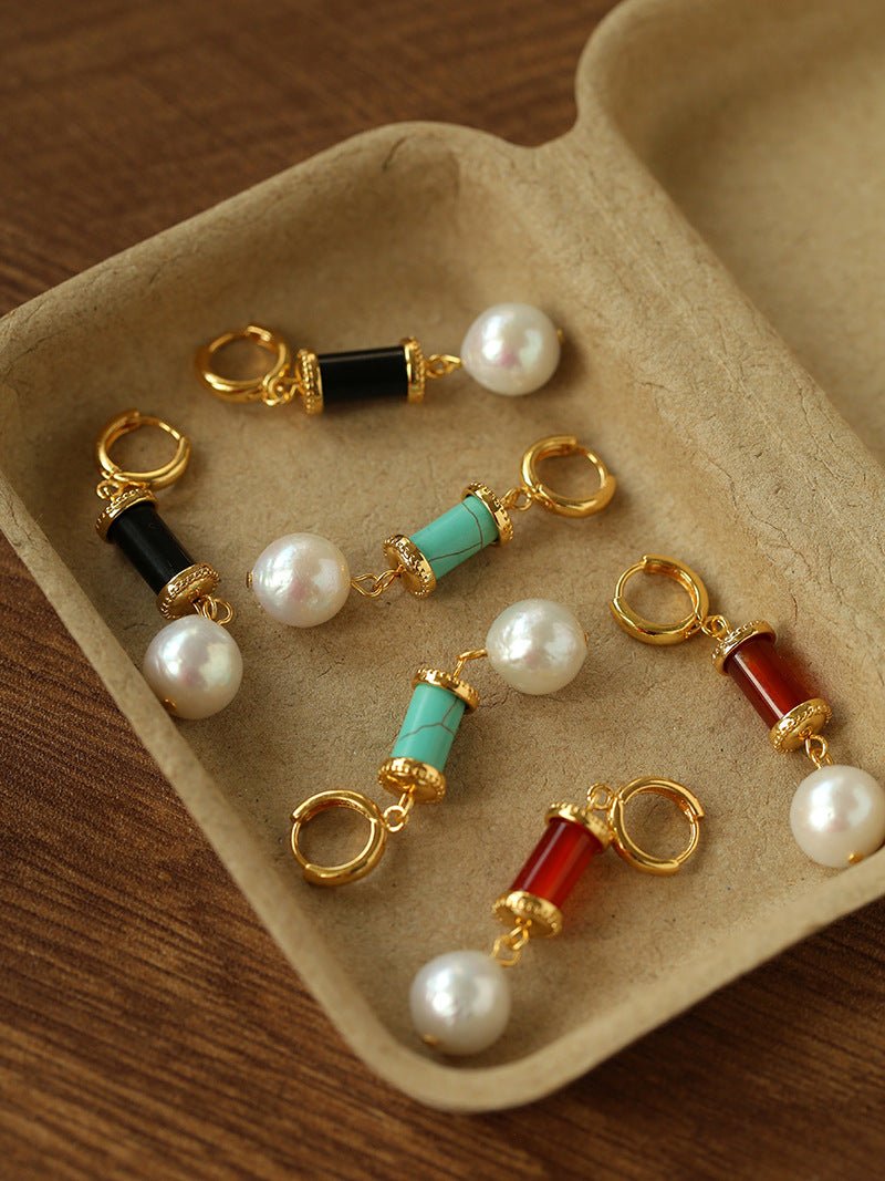 Designed for Spring 2026, these vintage-inspired earrings combine natural stones and pearls in a refined yet wearable way.Deep red agate, grounding black agate, refreshing turquoise, and natural freshwater pearls are carefully paired to create a rich but harmonious color balance. The subtle irregularity adds movement and character, giving the earrings a timeless, artisanal feel.