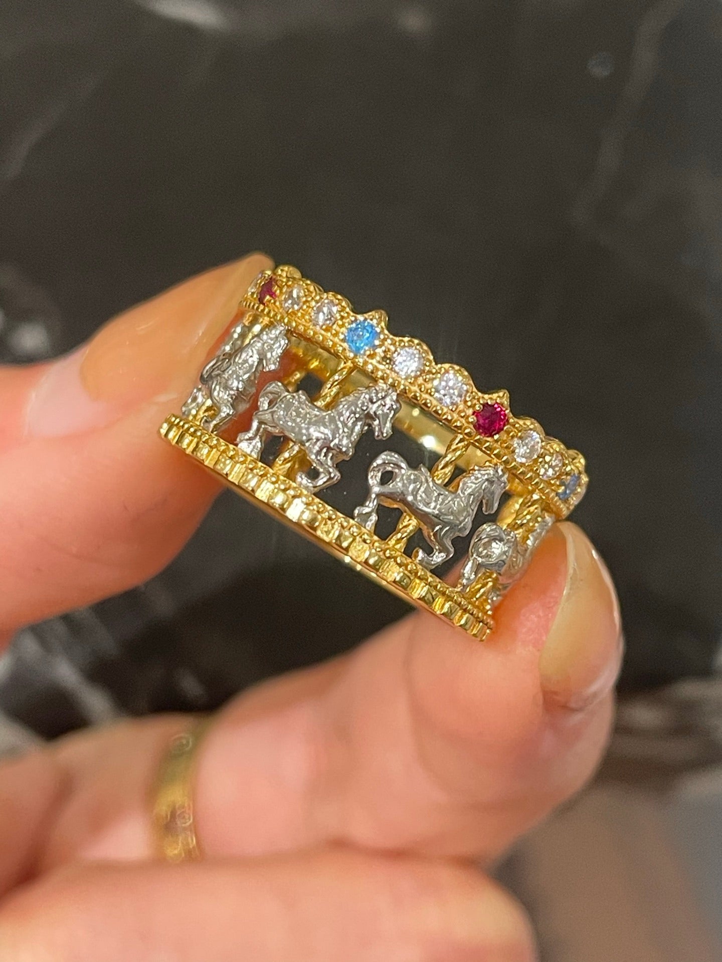Delicately sculpted horses encircle the band in a lively, three-dimensional design,