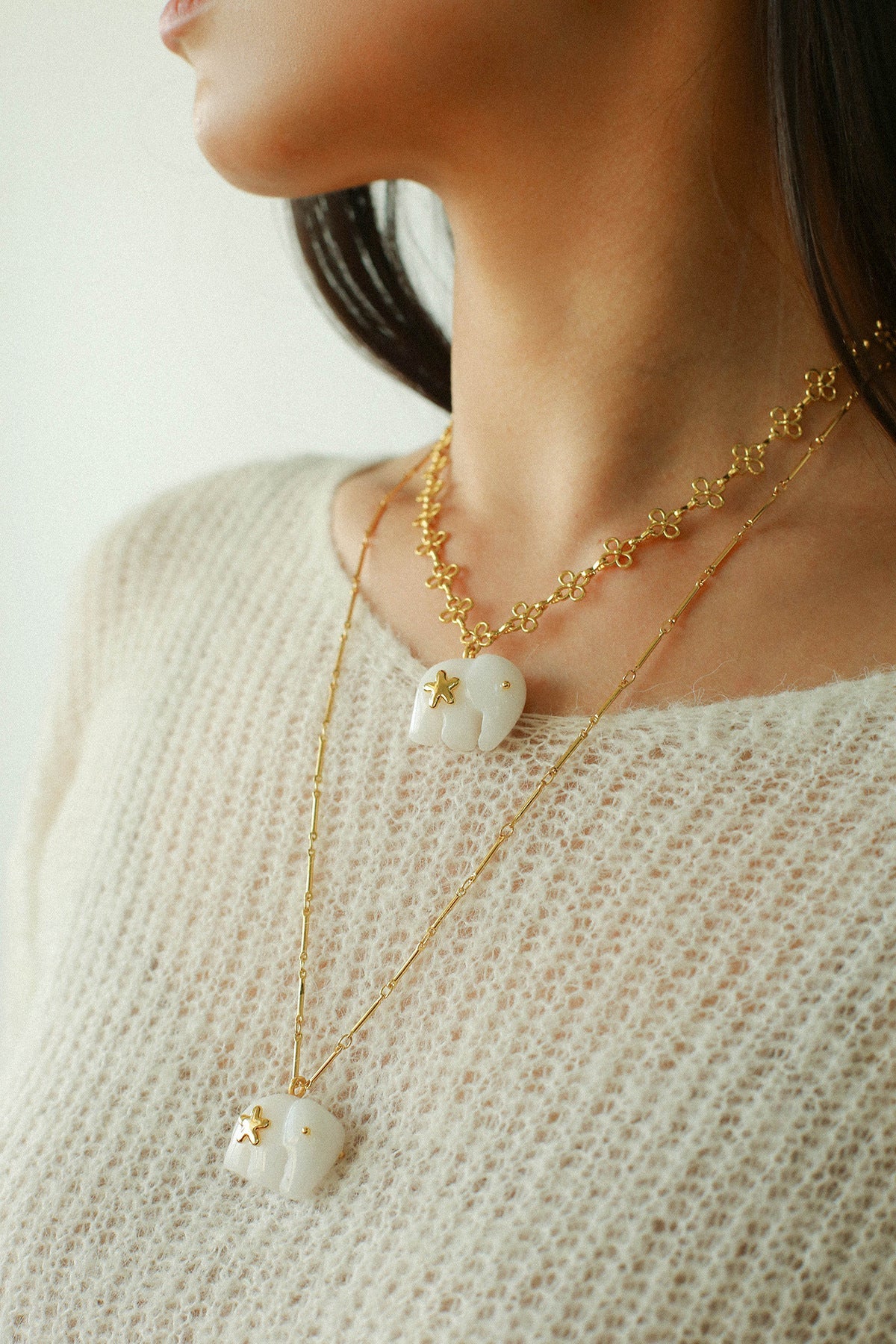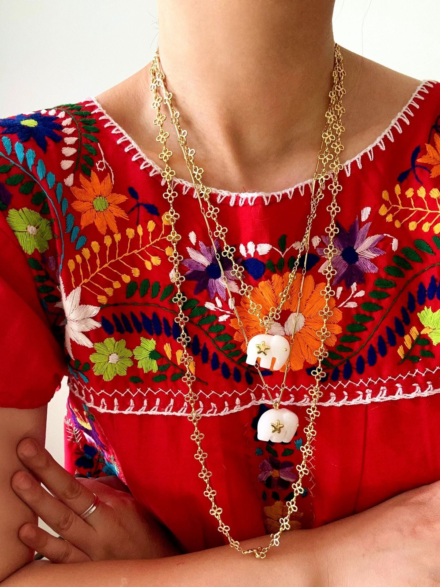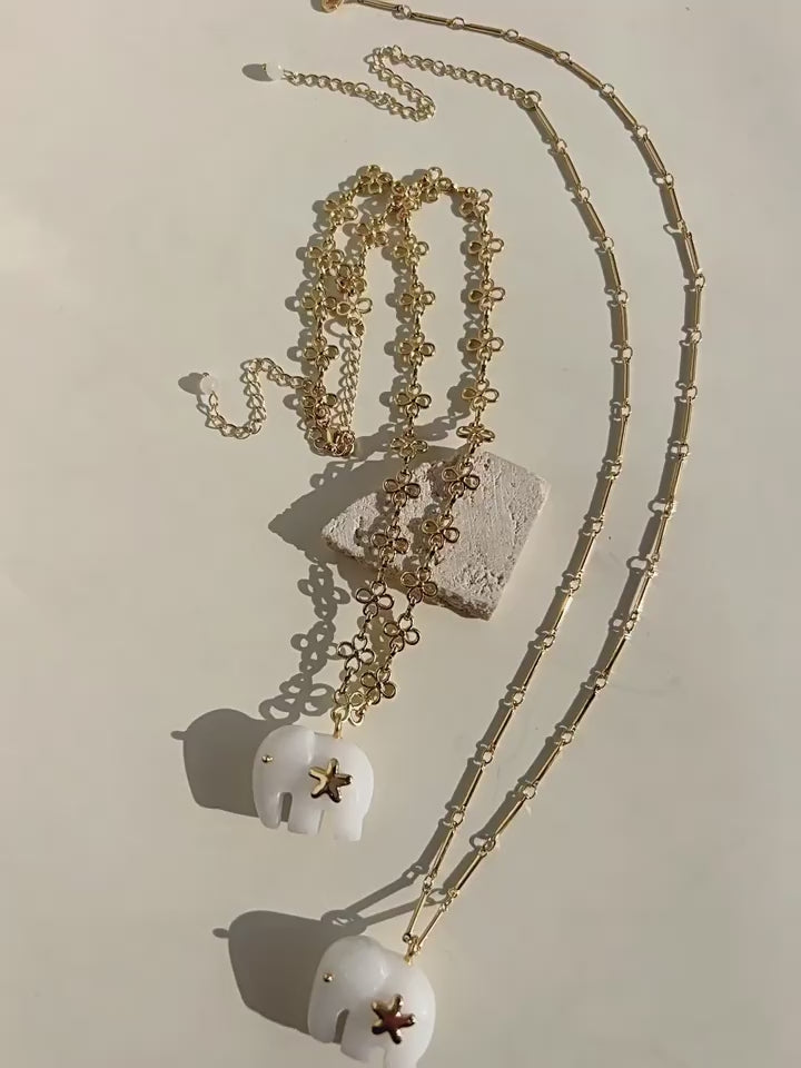 Hand-carved from natural white jade, the elephant pendant symbolizes luck, wisdom, and protection. The smooth texture of jade brings a calm yet powerful presence, beautifully contrasted with 18K gold-plated brass chains.Wear it alone for a minimalist statement or layer it with colorful gemstone necklaces for a true boho-inspired look.