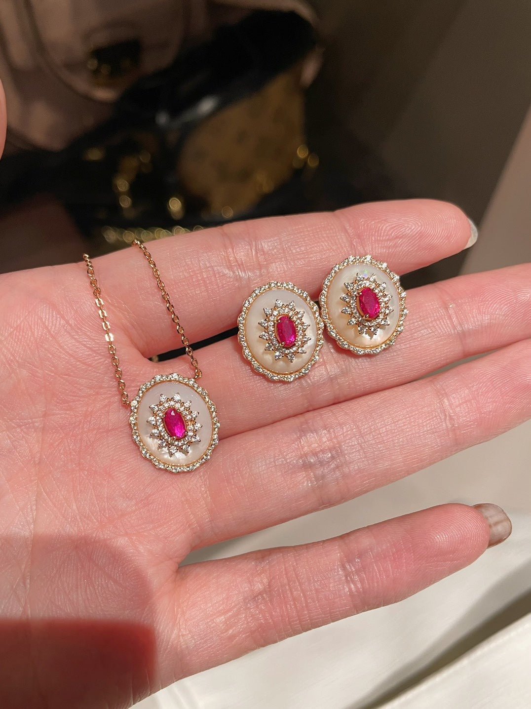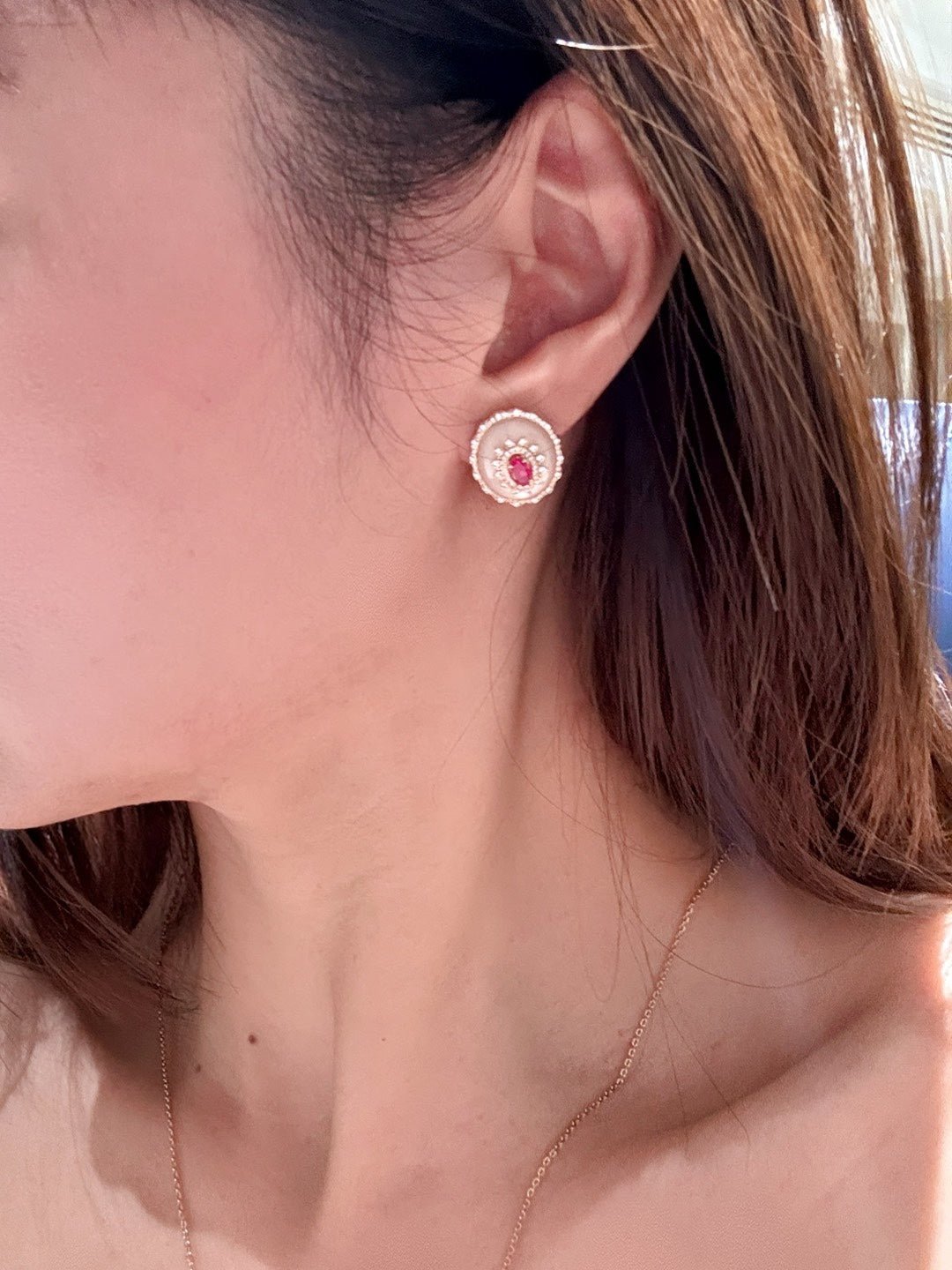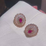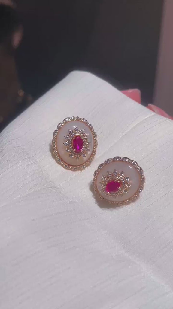Luxury Craft Vintage Court-Style Ruby & Mother-of-Pearl Cabochon Stud Earrings